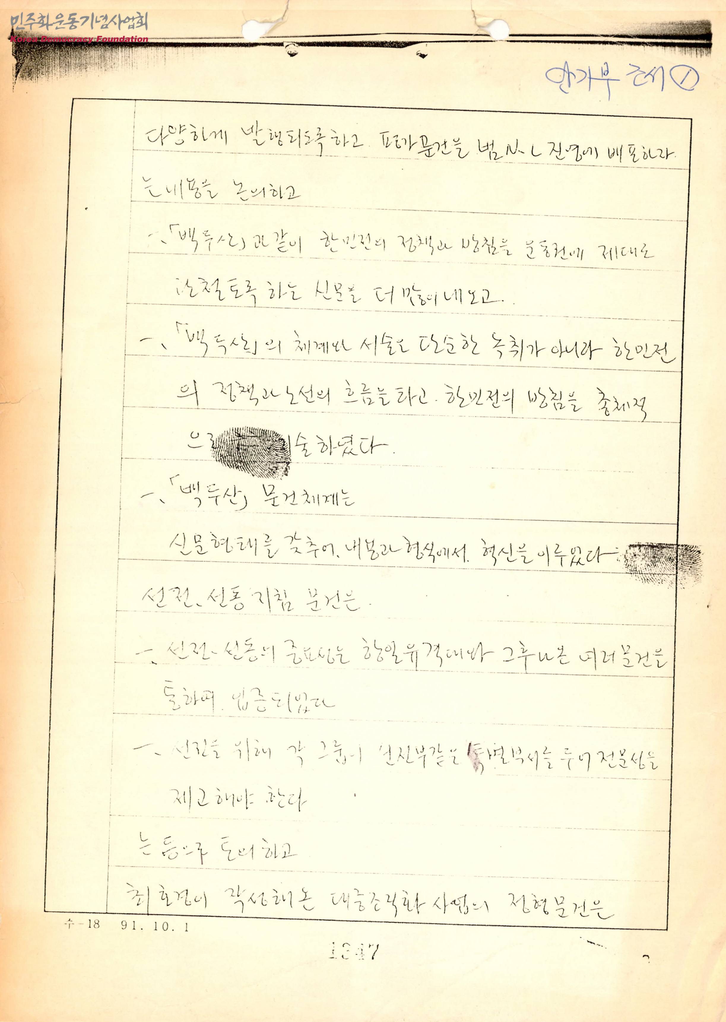 - 백두산' 같이 한민전의 정책과 방침을 운동권에 제대로 관철토록 하는 신문을 더 많이 내오고 체계와 서술을 한민전의 정책과 노선의 흐름을 타고 총체적으로 기술했다는 것, 선전을 위해 그룹 선전부 같은 특별부서를 두어 전문성을 제고해야 한다는 등으로 토의했다는 것 등 양심수의 죄목에 대한 안기부 조사 사항이 적혀있는 문서