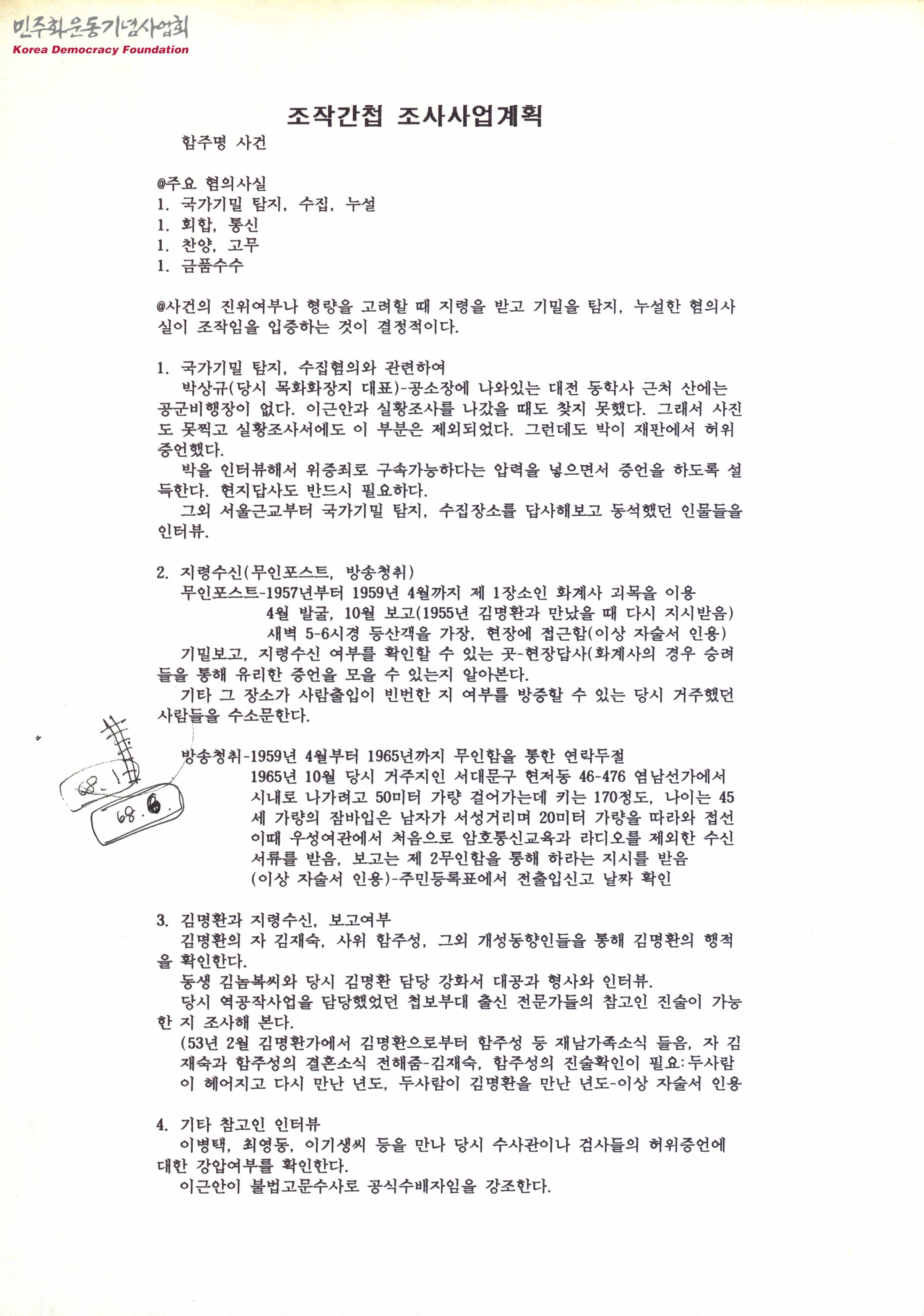 - 함주명 사건에 대한 조작간첩 조사사업계획의 내용이 수록된 문서로 목차는 다음과 같음 1. 국가기밀 탐지, 수집혐의와 관련하여 2. 지령수신(무인포스트, 방송청취) 3. 김명환과 지령수신, 보고여부 4. 기타 참고인 인터뷰