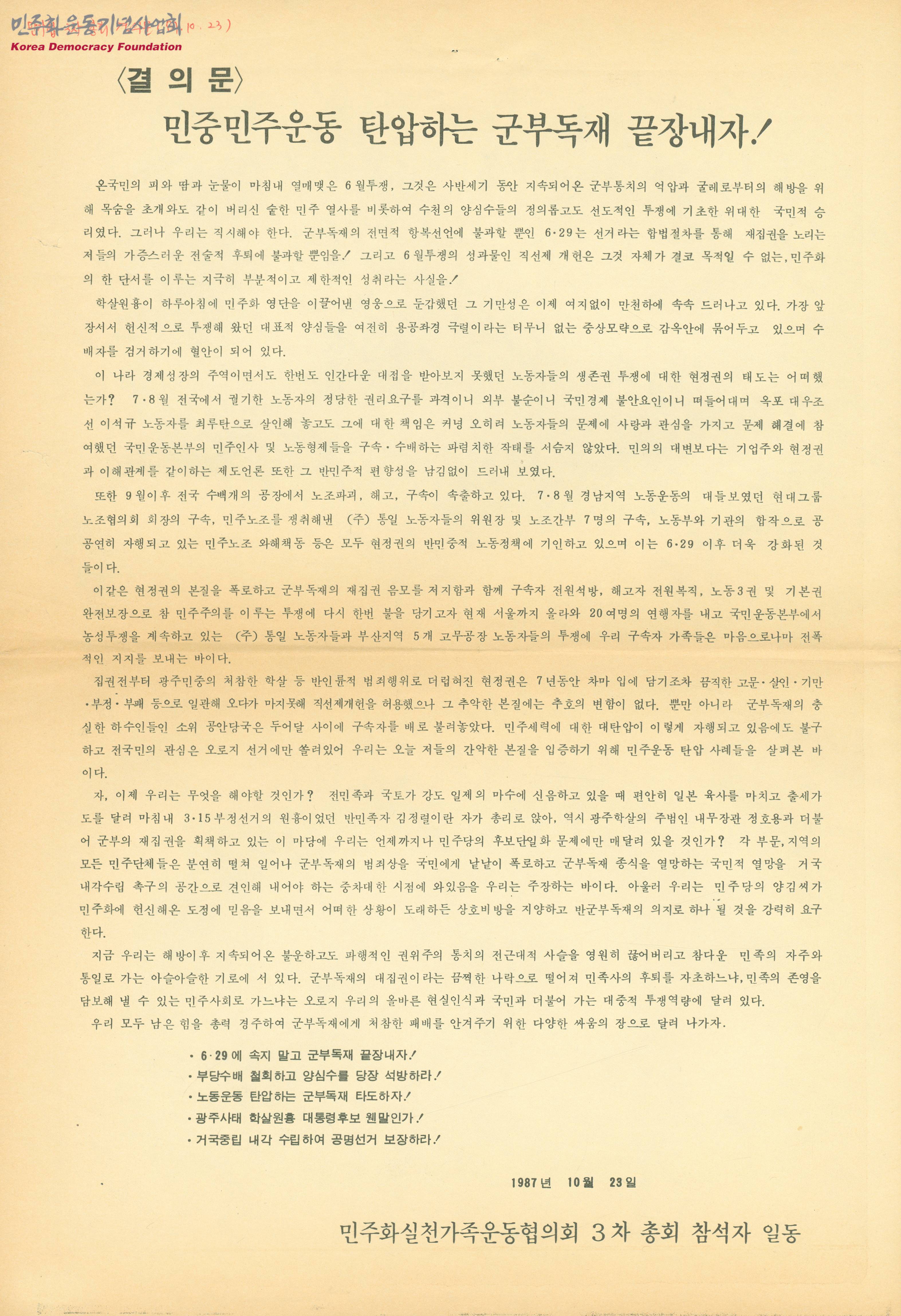 결의문-민중민주운동 탄압하는 군부독재 끝장내자