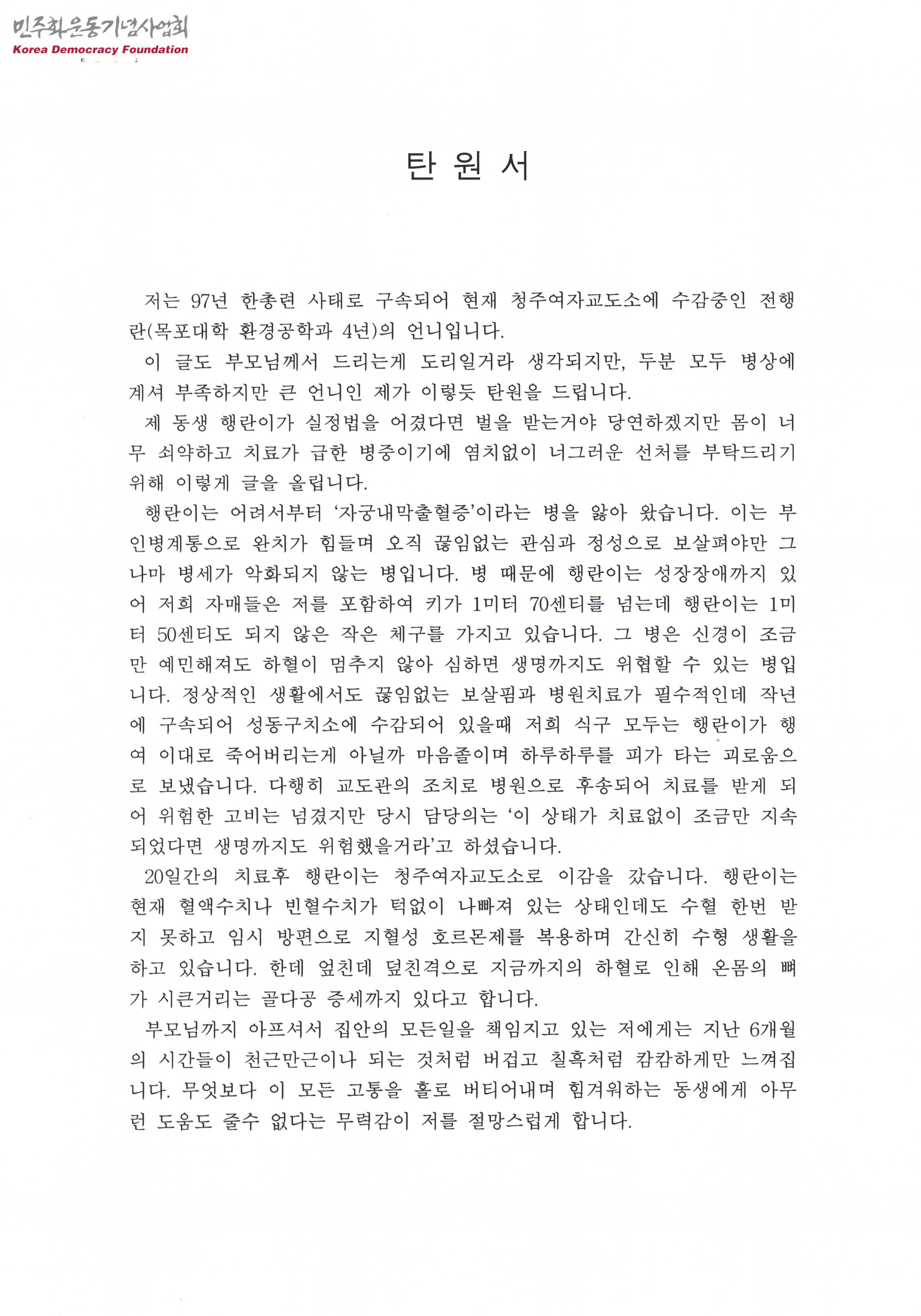 - 97년 한총련 사태로 구속되어 청주여자교도소에 수감중인 전행란씨에 대해 실정법을 어긴것에 벌을 받는것이야 당연하지만, 몸이 쇠약하고 치료가 급한 병중이기에 선처를 요청하는 내용이 수록된 문서