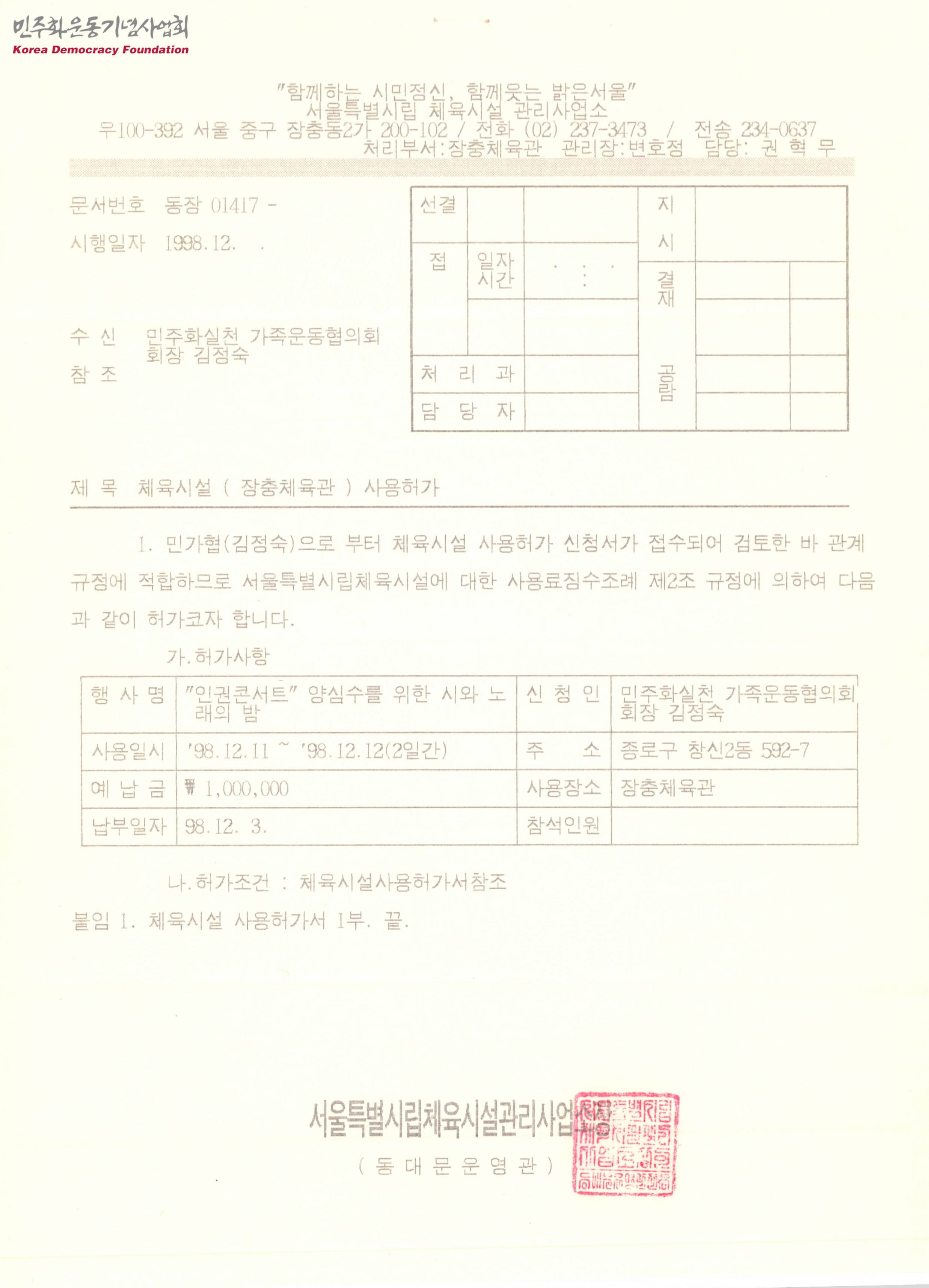 - 민가협으로부터 체육시설 사용허가 신청서가 접수되어 검토한 바 규정에 적합하므로 사용을 허가코자 한다는 내용의 공문으로 체육시설 사용 허가서와 허가조건이 첨부됨