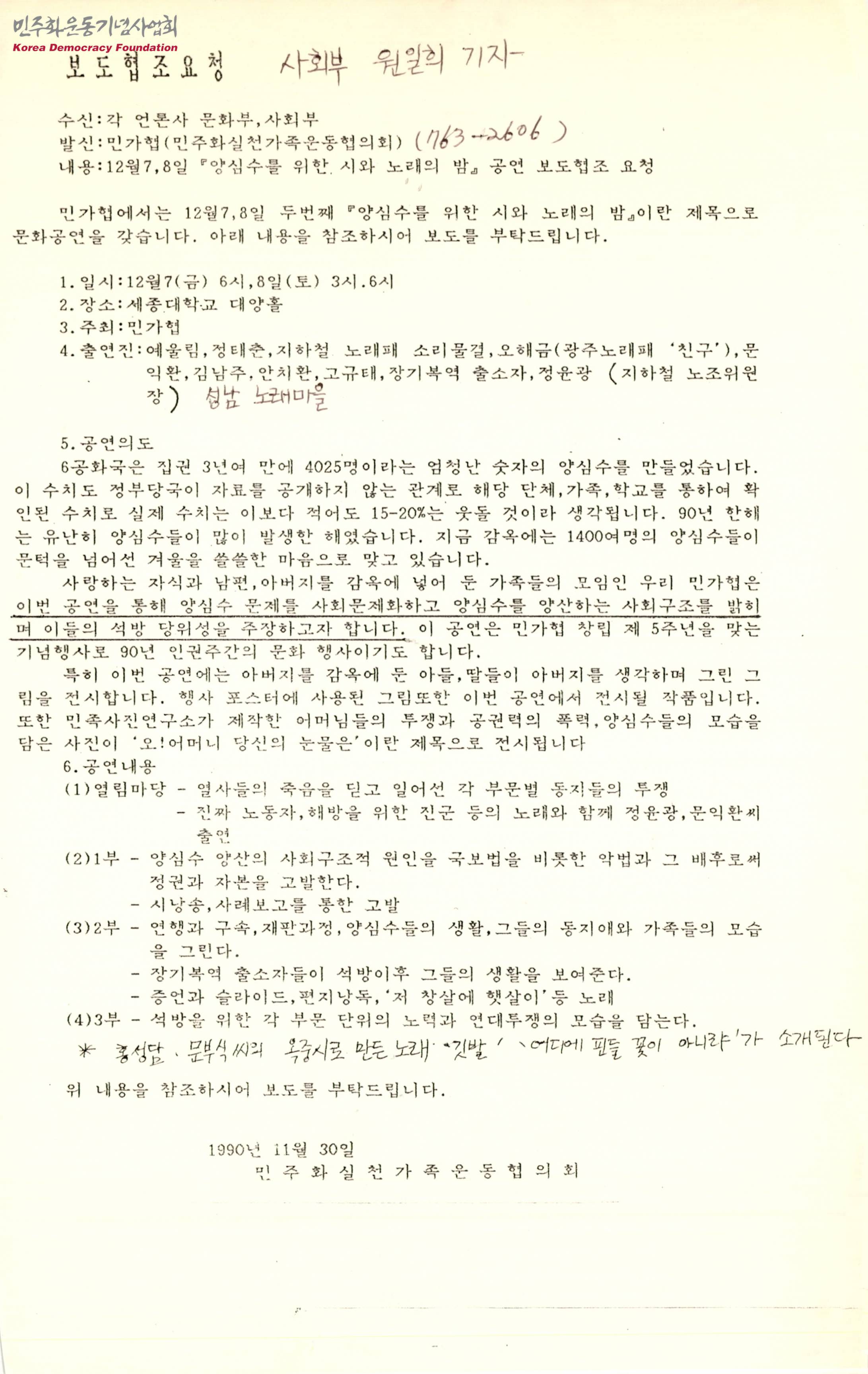- 민가협에서 12월 7, 8일 양일간 두번째 양심수를 위한 시와 노래의 밤이란 제목으로 문화공연을 진행하니 보도를 부탁한다는 내용의 문서 공연의 일시, 장소, 주최, 출연진, 공연의도 등이 적혀있음
