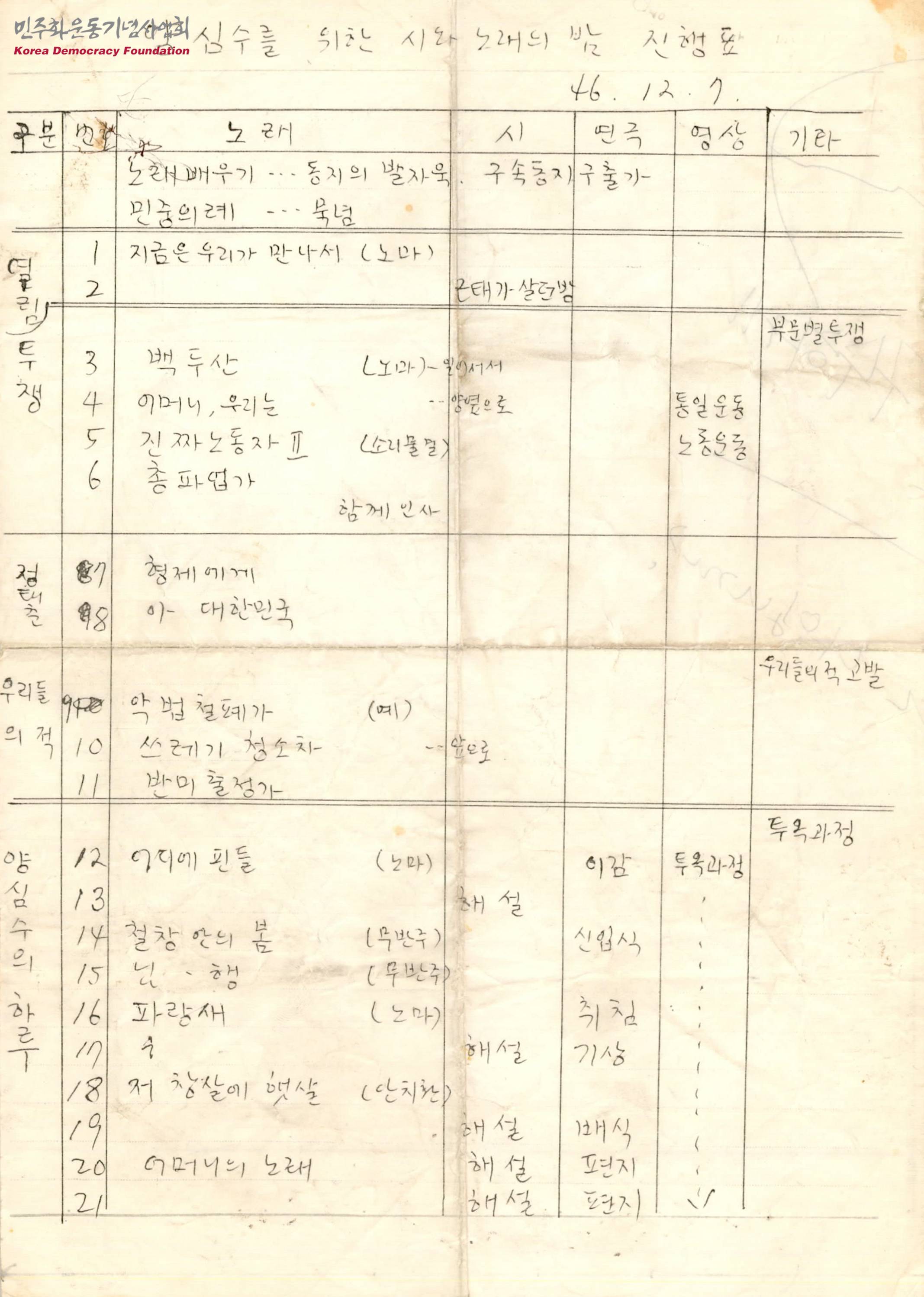 - 두번째 양심수를 위한 시와 노래의 밤 공연의 순서와 사용되는 노래, 시, 영상 등이 수록된 진행표