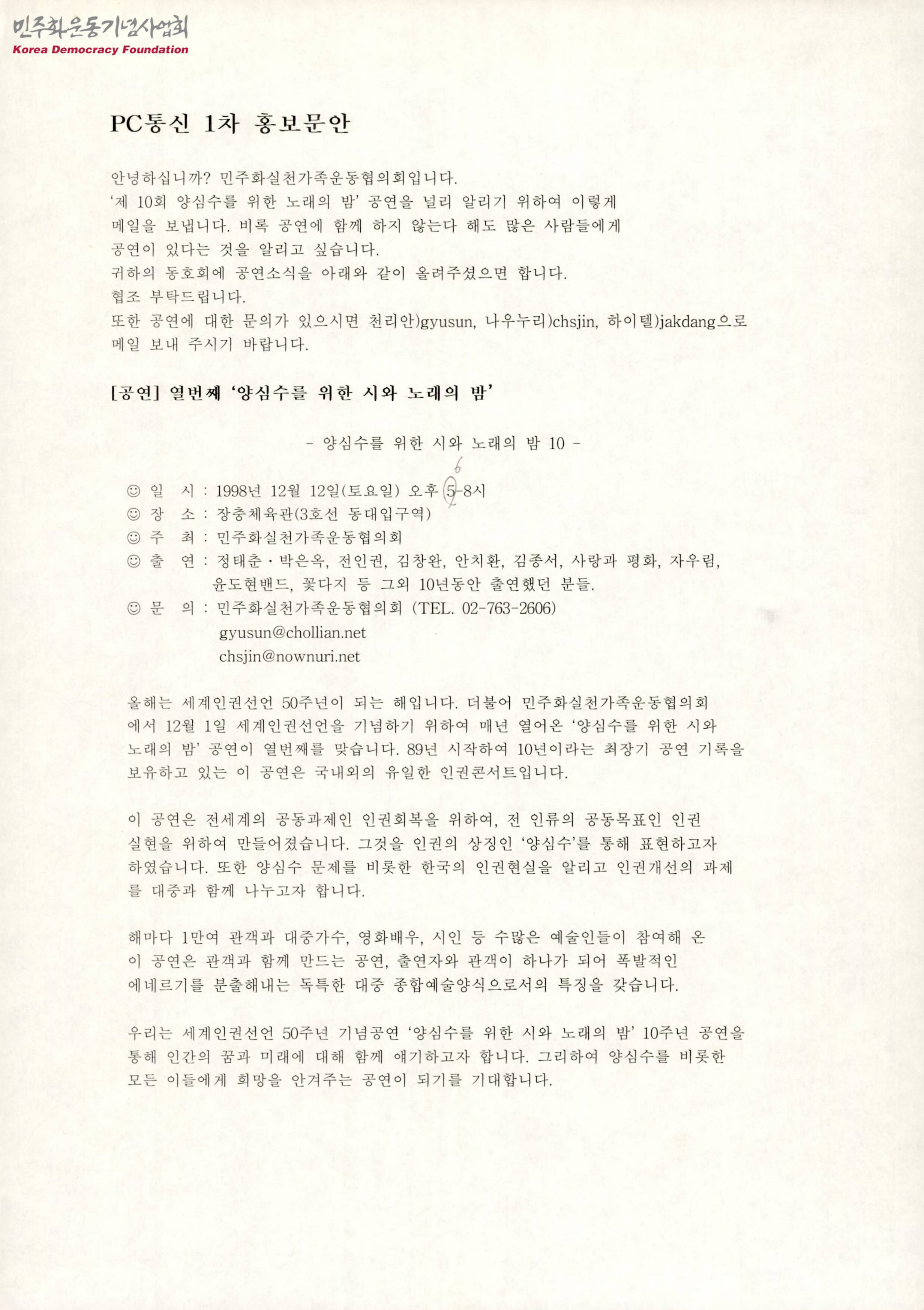 - 세계 인권선언 50주년을 맞이해 인권회복과 인권실현을 위한 양심수를 위한 시와 노래의 밤 10주년 공연을 홍보해달라는 내용의 PC통신 홍보문안