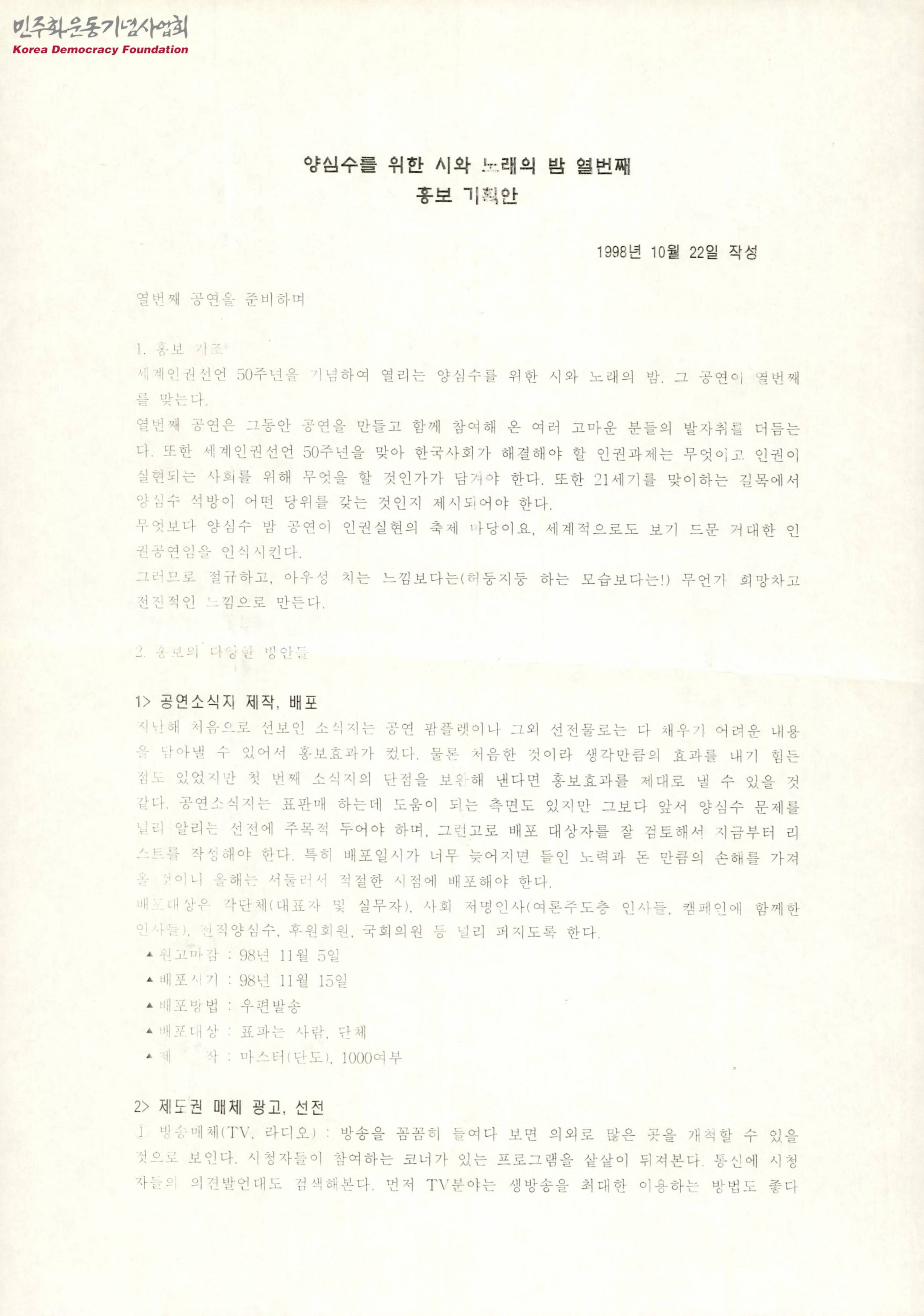 - 세계인권선언 50주년을 기념하여 열리는 양심수를 위한 시와 노래의 밤 열번째 공연의 홍보 기획안으로 목차는 다음과 같음 1. 홍보 기조 2. 홍보의 다양한 방안들 -공연소식지 기획안
