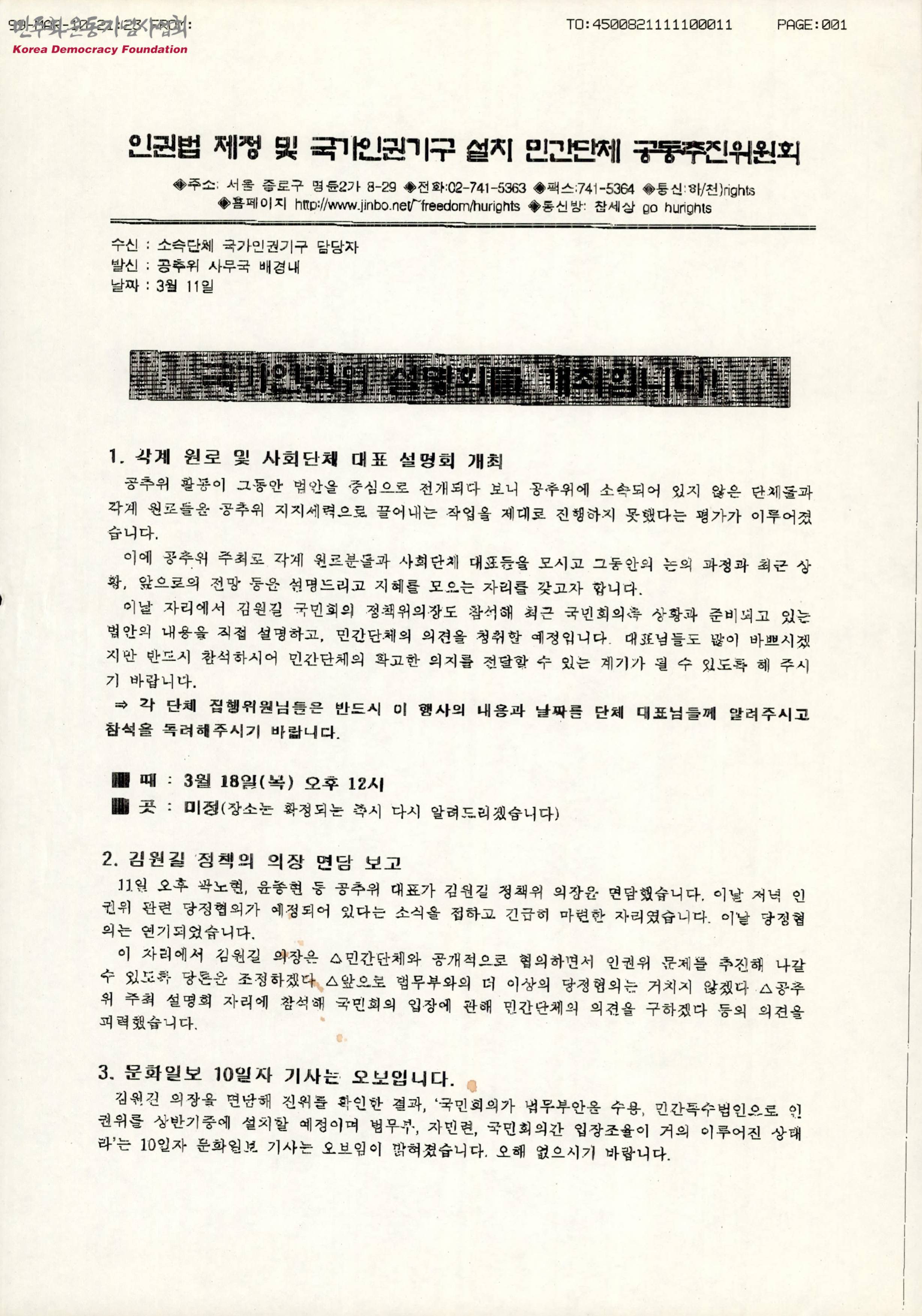 - 공추위에 소속되어 있지 않은 단체들과 각계 원로들을 지지세력으로 끌어내는 작업을 제대로 진행하지 못했다는 평가를 받아들여 각계 원로들과 사회단체 대표들을 모시고 그동안의 논의과정과 최근 상황, 앞으로의 전망을 설명하고 지혜를 모으는 자리를 갖고자 한다는 것, 김원길 정책위 의장 면담 보고 등의 내용이 수록된 공문