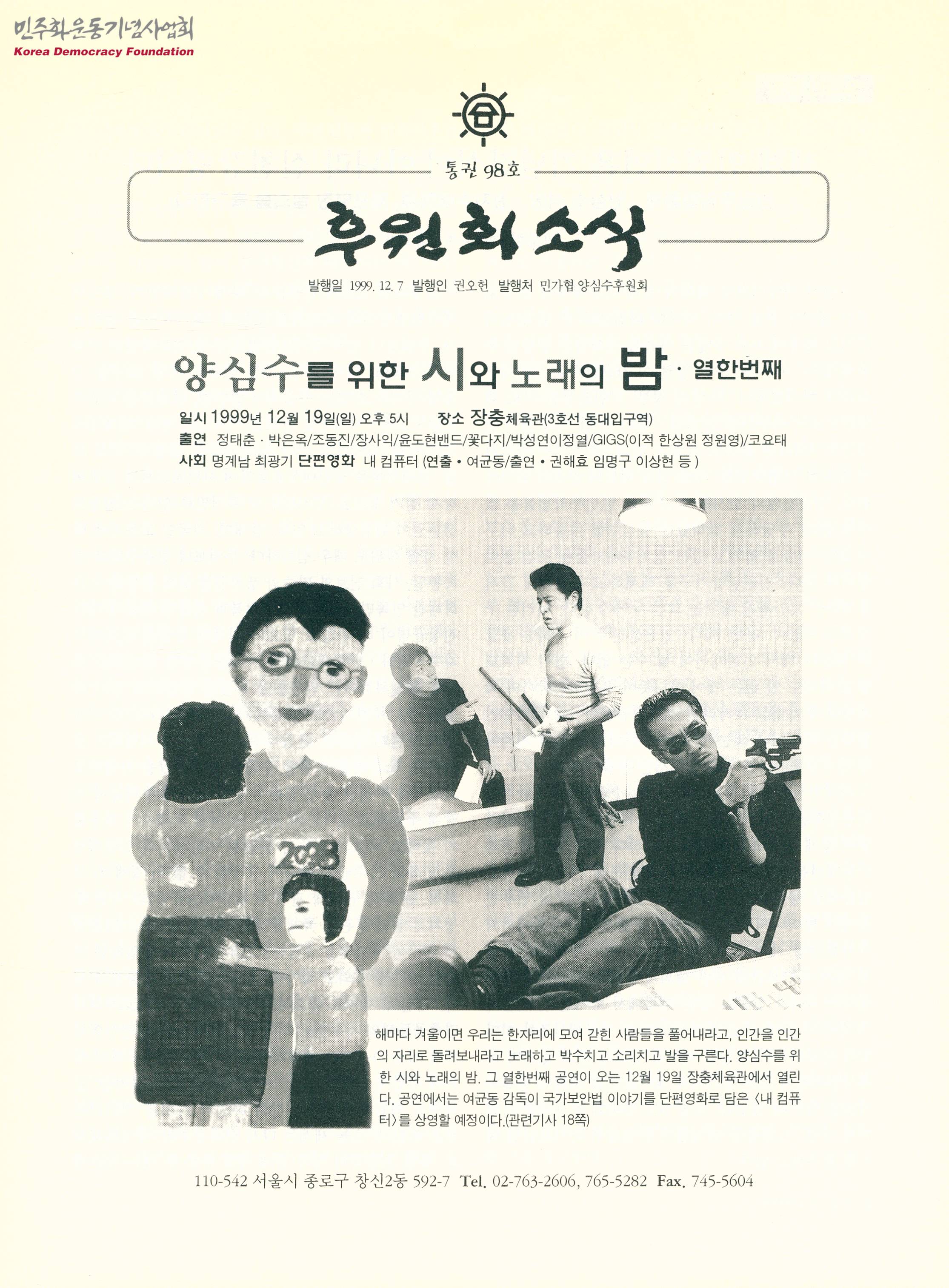 - 양심수를 위한 시와 노래의 밤 열한번째 공연의 일시와 장소, 세계인권선언은 기념장식이 아니라 실천강령이기에 반민주악법 철폐와 양심수 석방, 정치수배해제를 촉구한다는 글, 양심수를 위한 시와 노래의 밤 행사를 준비하는 모습에 대한 글 등이 수록된 정간물