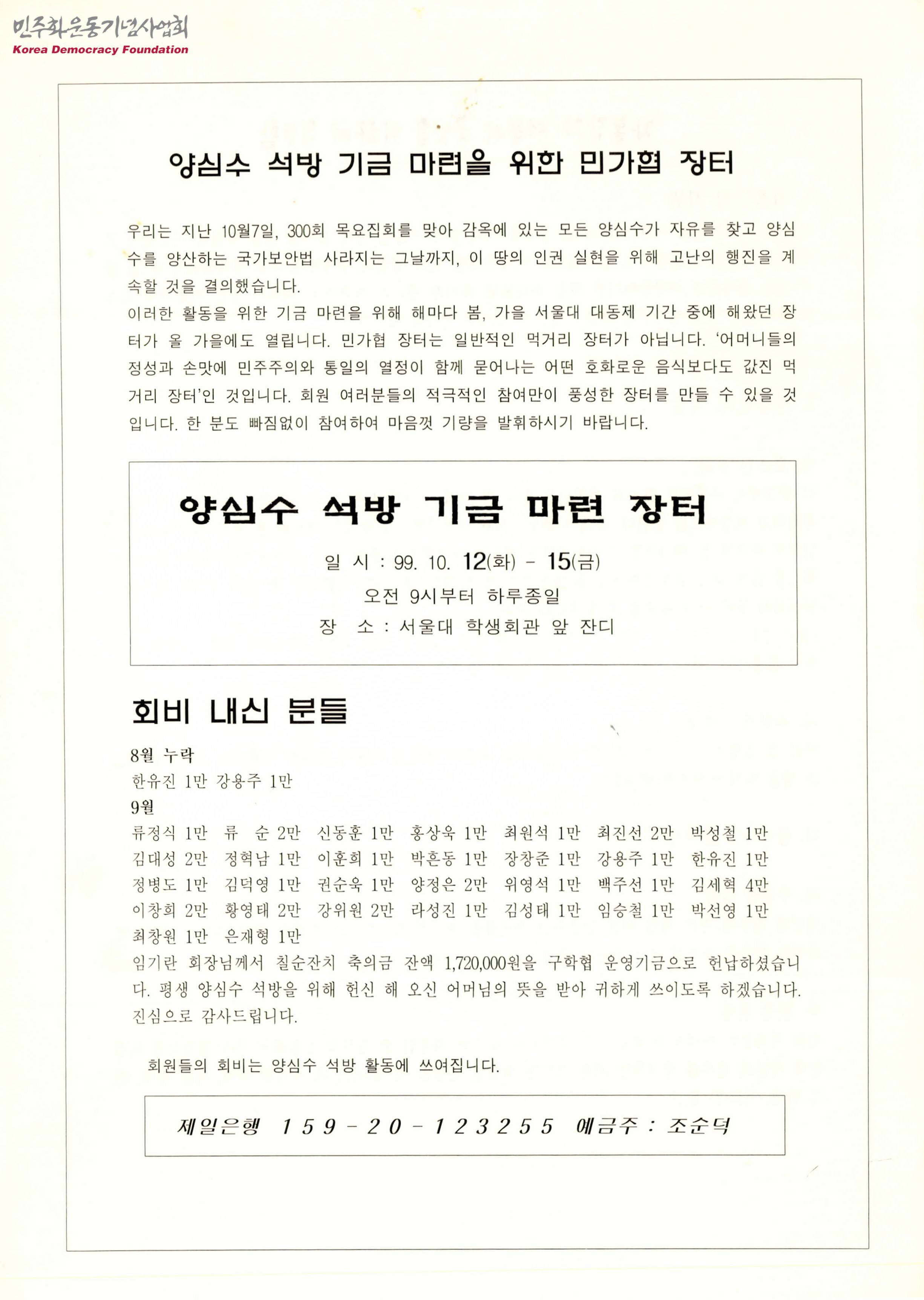 - 모든 양심수가 자유를 찾고 양심수를 양산하는 국가보안법이 사라지는 그날까지 고난의 행진을 계속하기 위한 기금마련을 위해 양심수 석방 기금 마련 장터가 열리게 되었으니 빠짐없이 참석해 마음껏 기량을 발휘해 달라는 내용의 문서