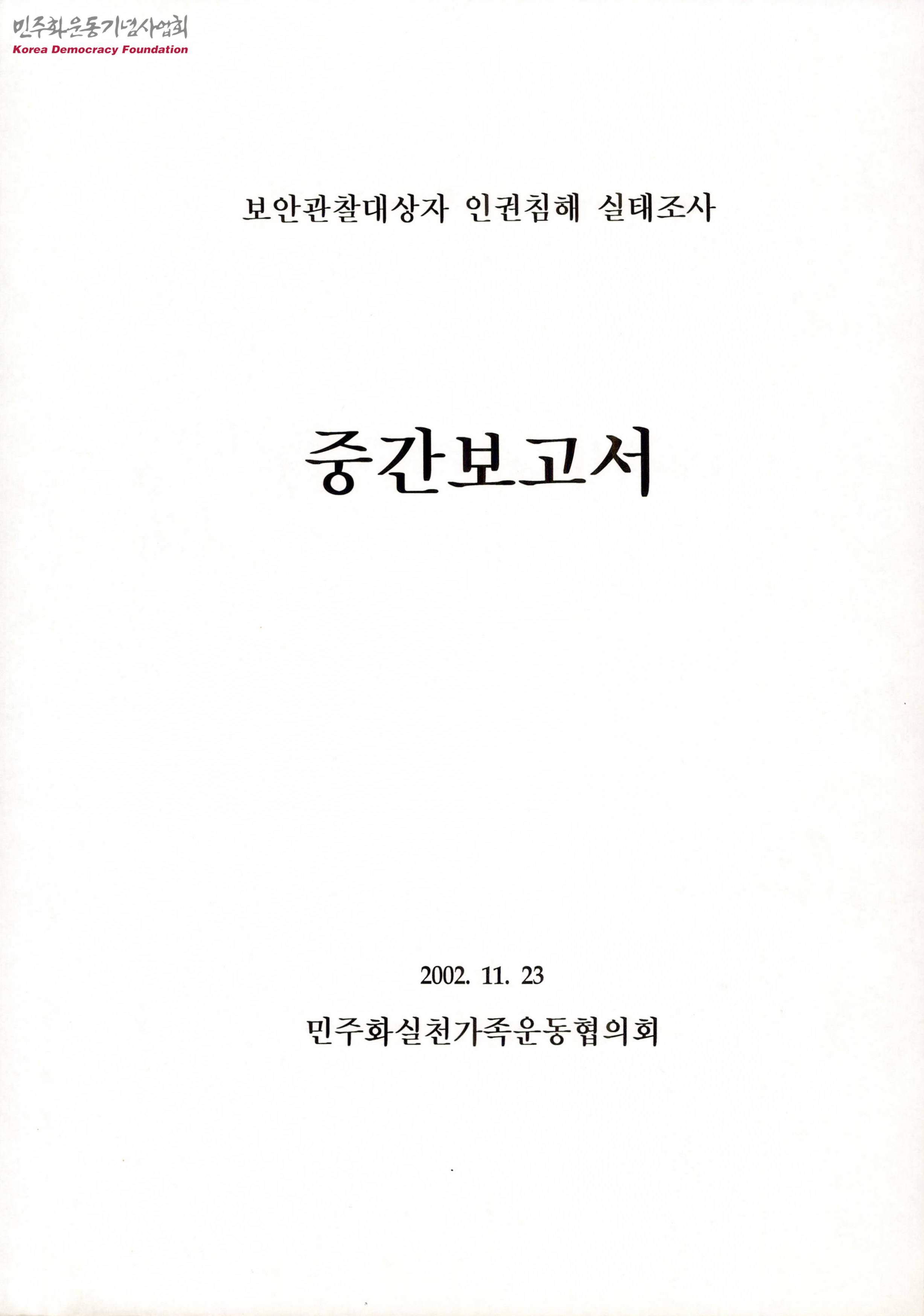 - 보안관찰처분이 절대적 부정기형으로 사용될 위험성이 있음을 지적하며, 보안관찰법에 따른 인권침해 사례를 구체적으로 조사하고 정리해 이를 통해 문제점을 분석하고, 법·제도적 보호장치를 마련하기 위해 작성된 보고서로 아래와 같은 목차로 구성되어 있음 제1장 서론 -제1절 조사 목적 -제2절 선행 연구 제2장 보안관찰대상자 인권침해 실태조사 중간결과 분석 -제1절 조사개요 -제2절 조사방법 -제3절 피조사자 분석 -제4절 조사내용 분석 제3장 이후 조사계획 부록 : 조사항목