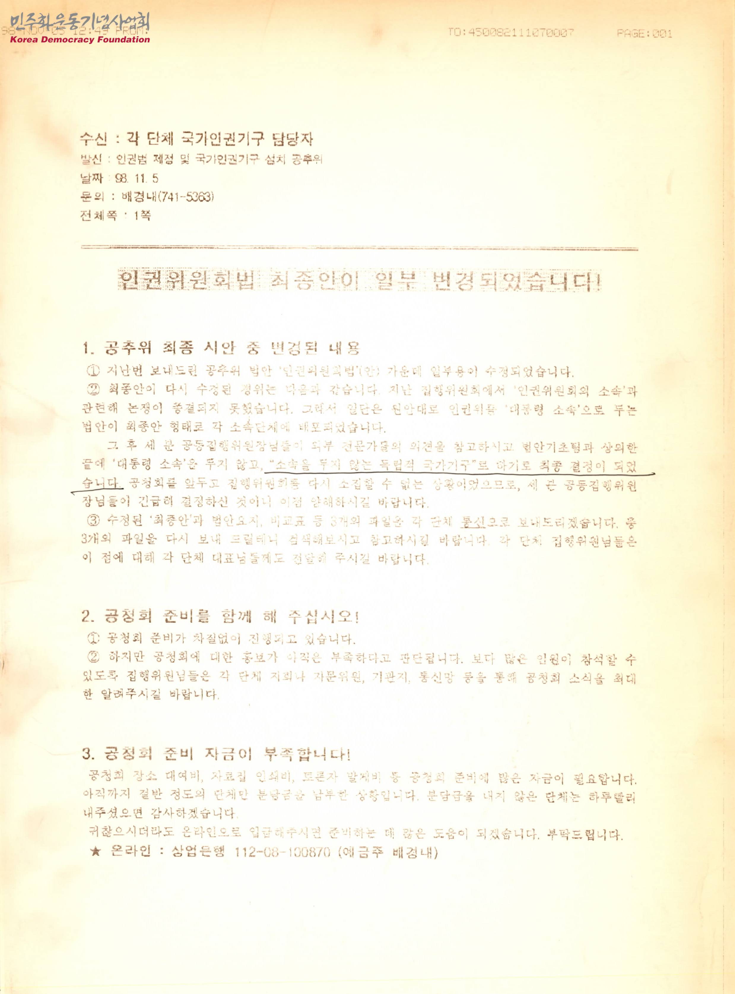 - 공추위 법안' 인권위원회법'안 가운데 인권위를 소속을 두지 않는 독립적 국가기구로 명명하기로 결정되었으며, 공청회 개최를 위해 준비와 준비 자금을 요청하는 내용이 수록된 문서