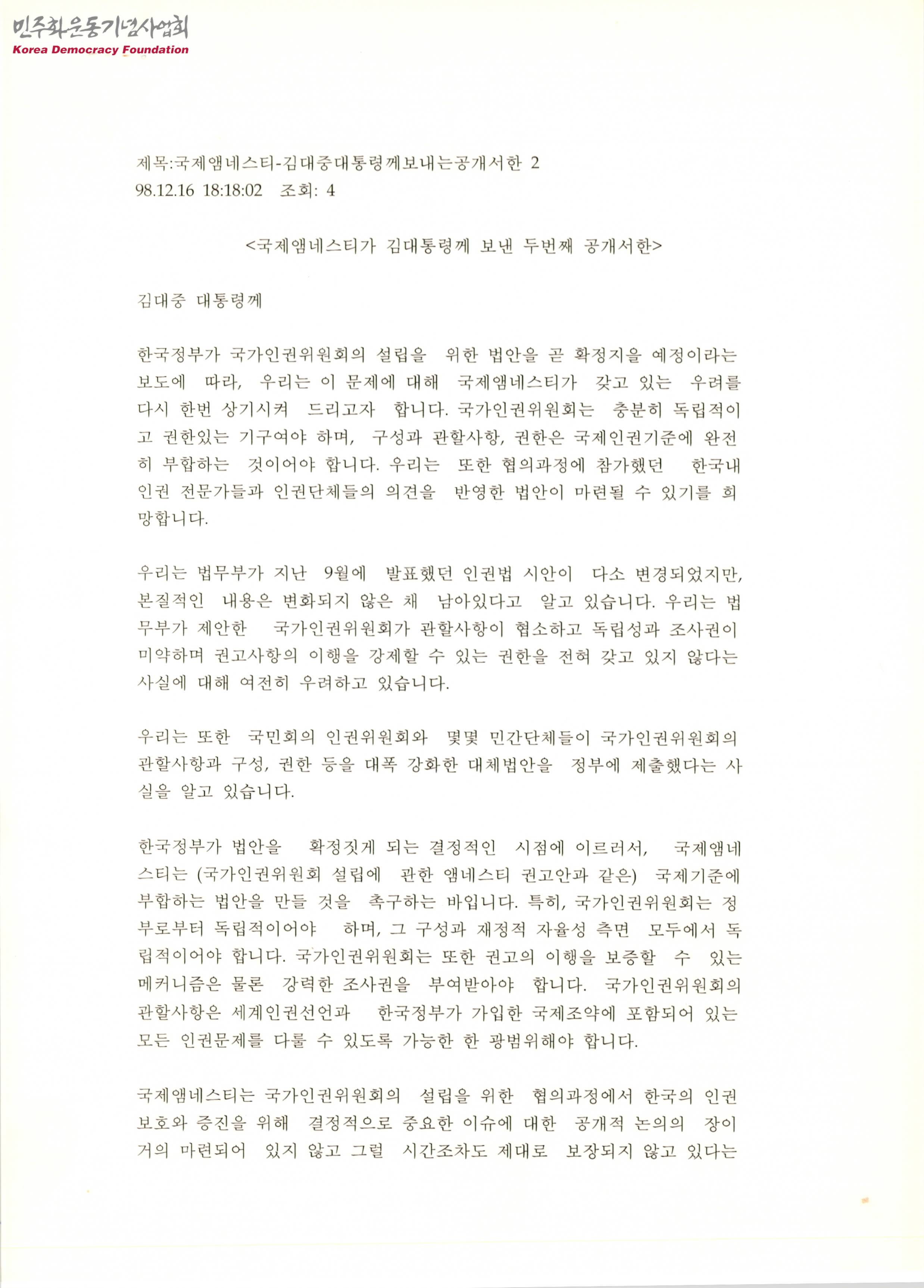 국제앰네스티가 김대통령께 보낸 두번째 공개서한