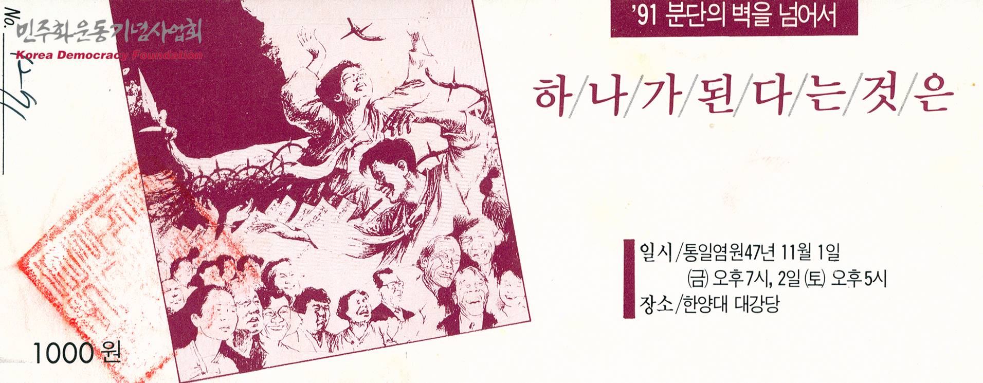 - 91년 '분단의 벽을 넘어서'를 주제로 열리는 통일 관련 행사의 입장권