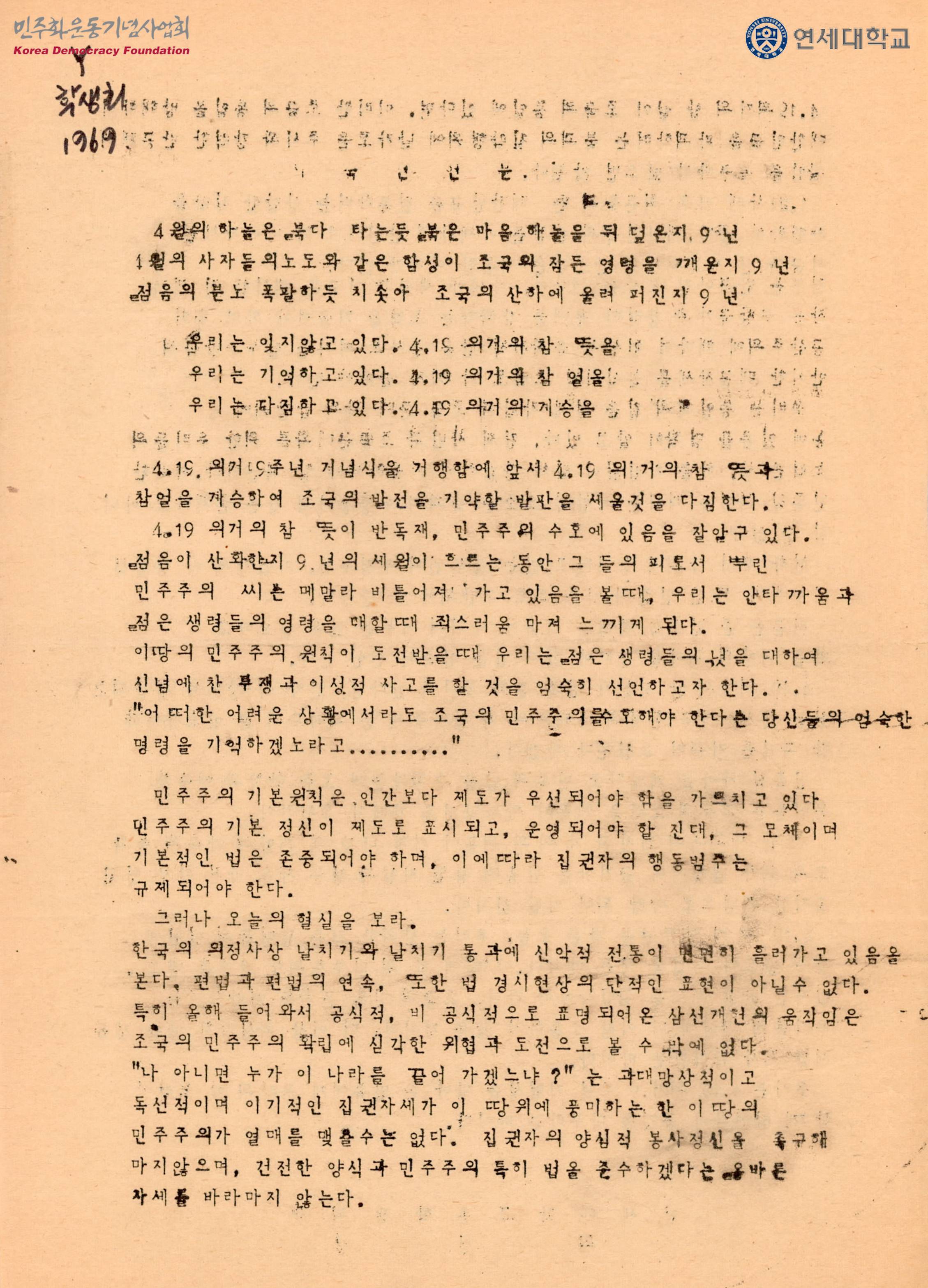 - 한국정치에서 자행되는 편법과 법 경시현상, 삼선개헌의 움직임 등을 비판하며, 집권자들에게 민주주의에 기반한 법 준수를 촉구하는 내용의 유인물