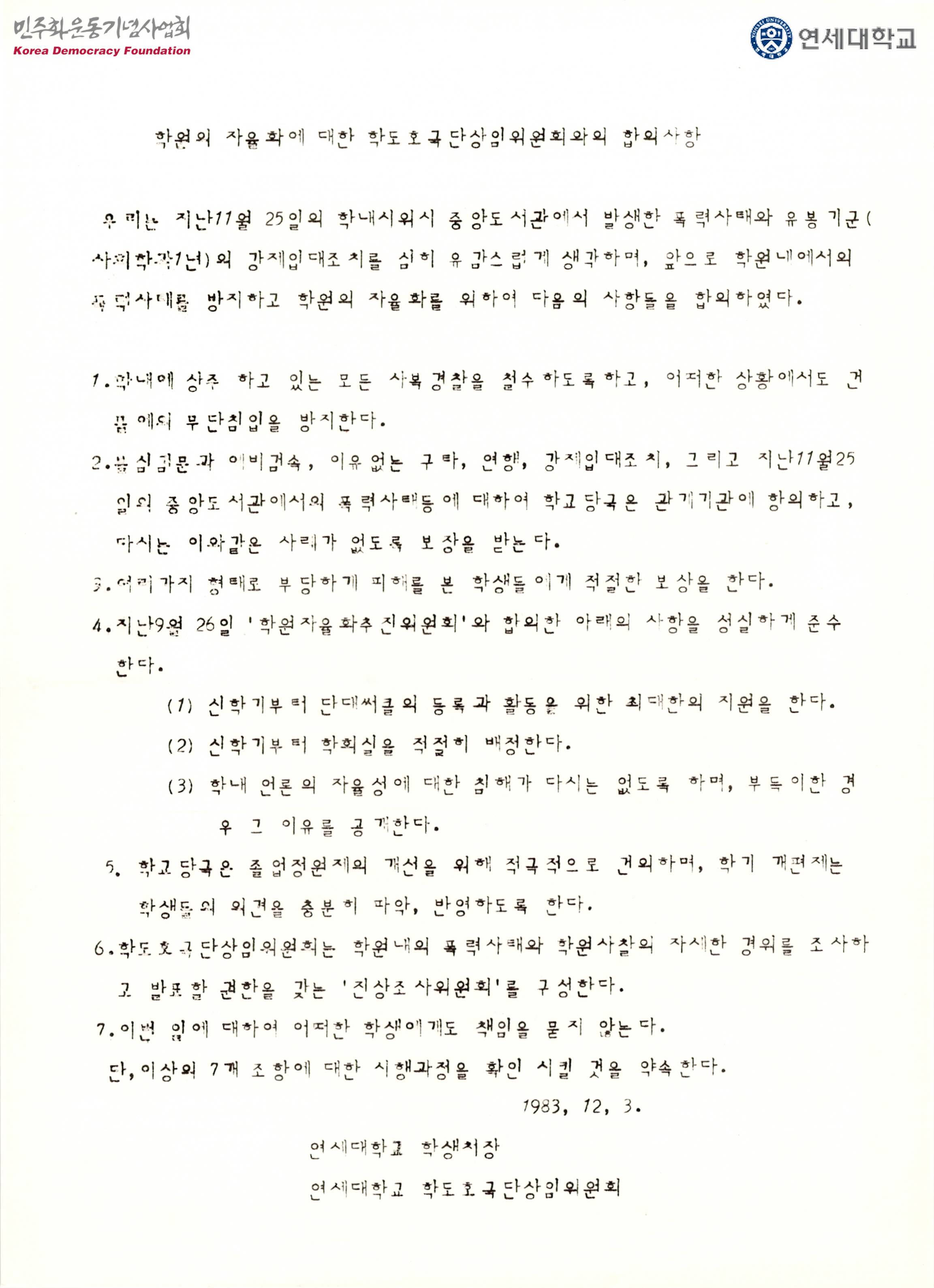 - 학내에서 자행된 폭력사태를 방지하고 학원의 자율화를 위해 학교 당국과 합의한 사항들이 담겨 있는 유인물