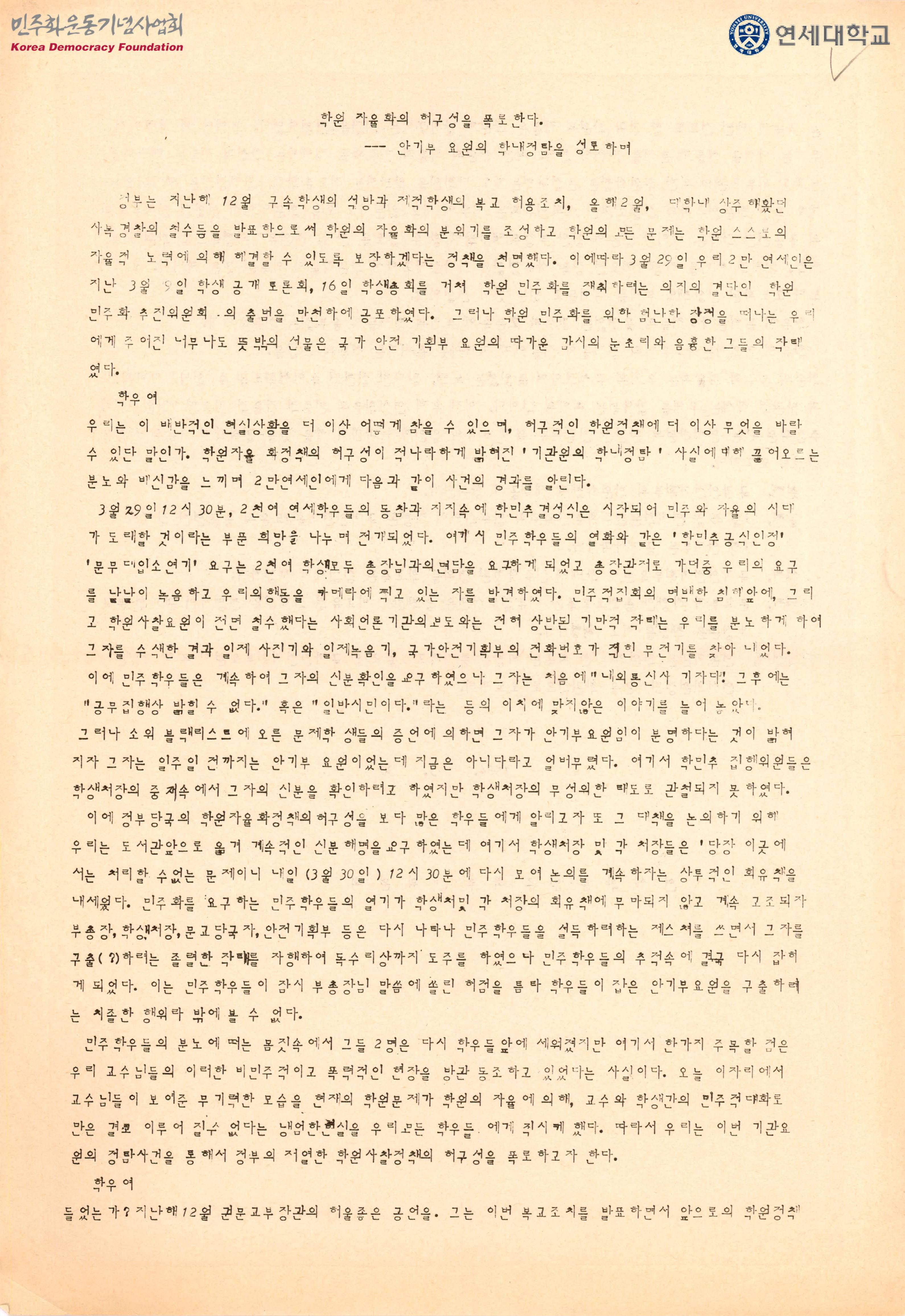 - 정부가 학원 자율화 분위기 조성과 학원 문제의 자율적 노력에 의한 해결을 보장하겠다는 정책을 발표한 것과 달리 학원내에서 기관요원의 정탐사건이 발생하자 정부의 학원정책의 허구성을 밝히며, 이에 대한 안기부의 사과와 학교 측의 해명 등의 요구가 담긴 유인물