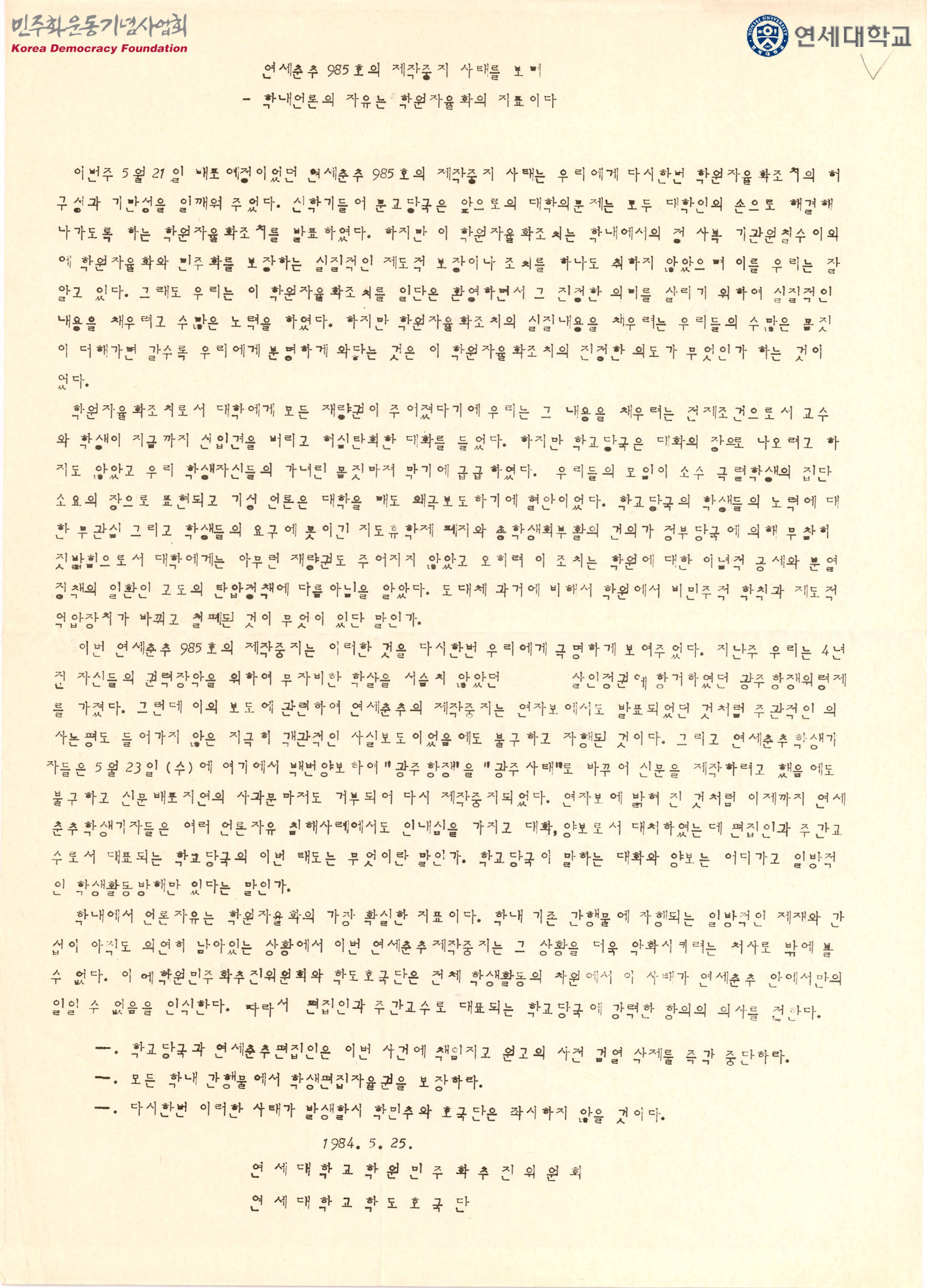 - 5·18민주화운동에 대한 보도를 신문에 실으려 하자, "연세춘추"를 제작중지 시킨 사건에 항의하며, 원고 사전 검열 삭제 중단과 학내 간행물의 편집자율권 보장 등을 요구하는 내용의 유인물