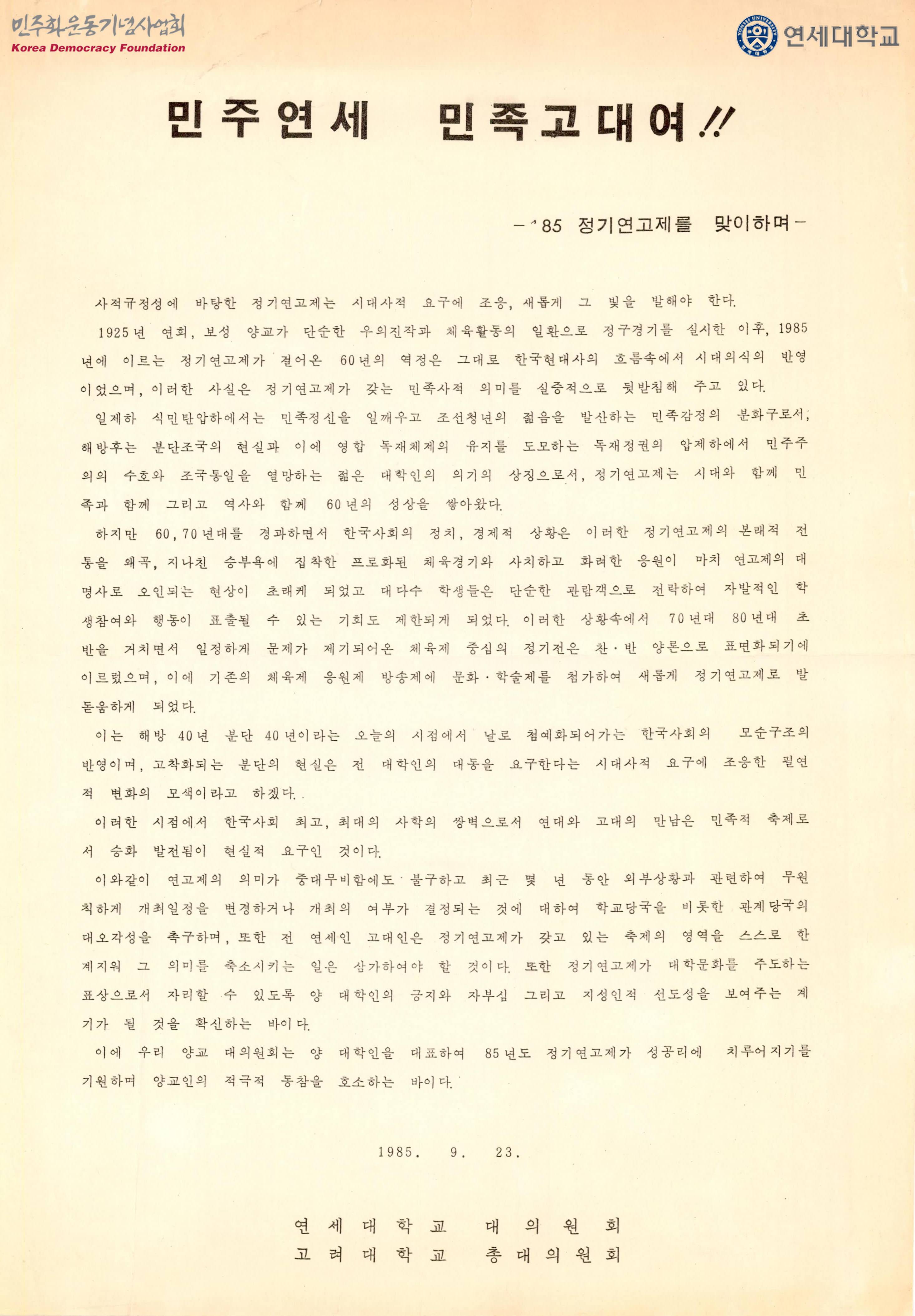 민주연세 민족고대여!! - '85 정기연고제를 맞이하며