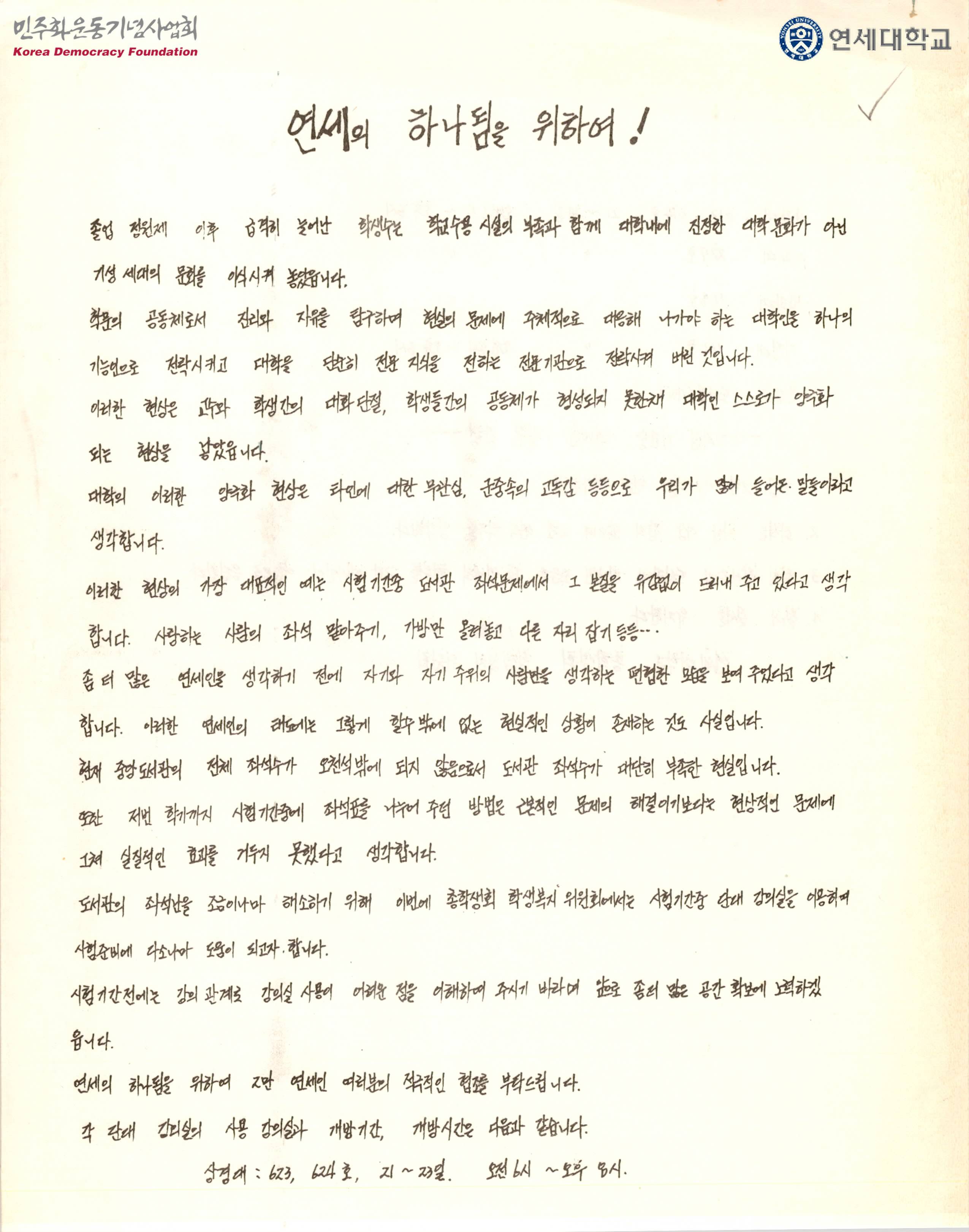 - 졸업 정원제 이후 학생 수는 늘었지만, 학교의 수용시설은 그렇지 못해 시험기간 중 도서관의 좌석부족 문제가 발생하자, 그로 인해 나타난 학생들의 이기적인 태도를 짚으며, 시험기간 중 단과대 강의실을 이용할 수 있도록 개방하겠다는 내용이 실려있는 유인물
