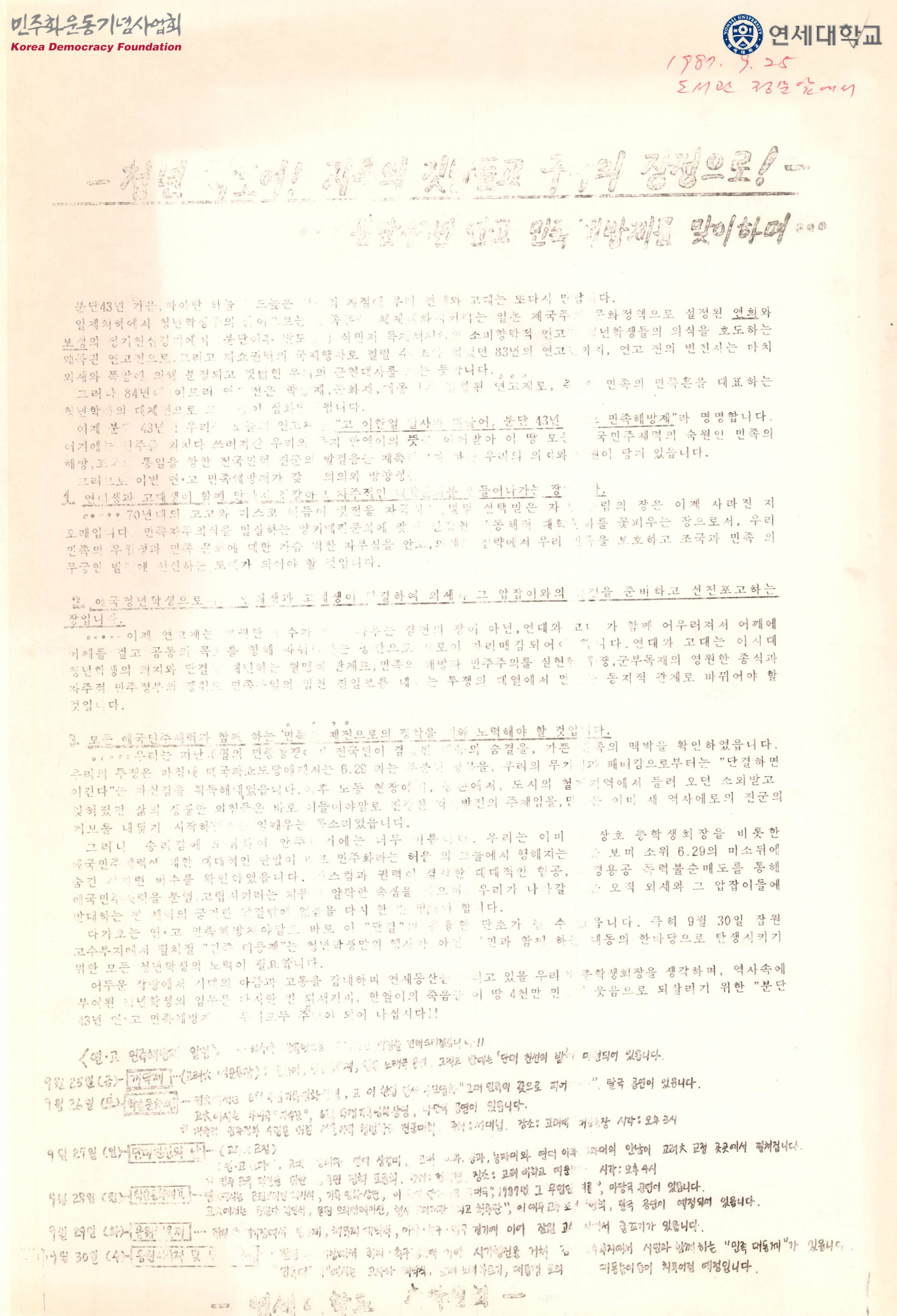 - 87년 연고제를 "고 이한열 열사와 더불어, 분단 43년 연고민족해방제"로 정의하며 해방제가 갖는 의의와 방향성에 대한 설명이 실려있는 유인물
