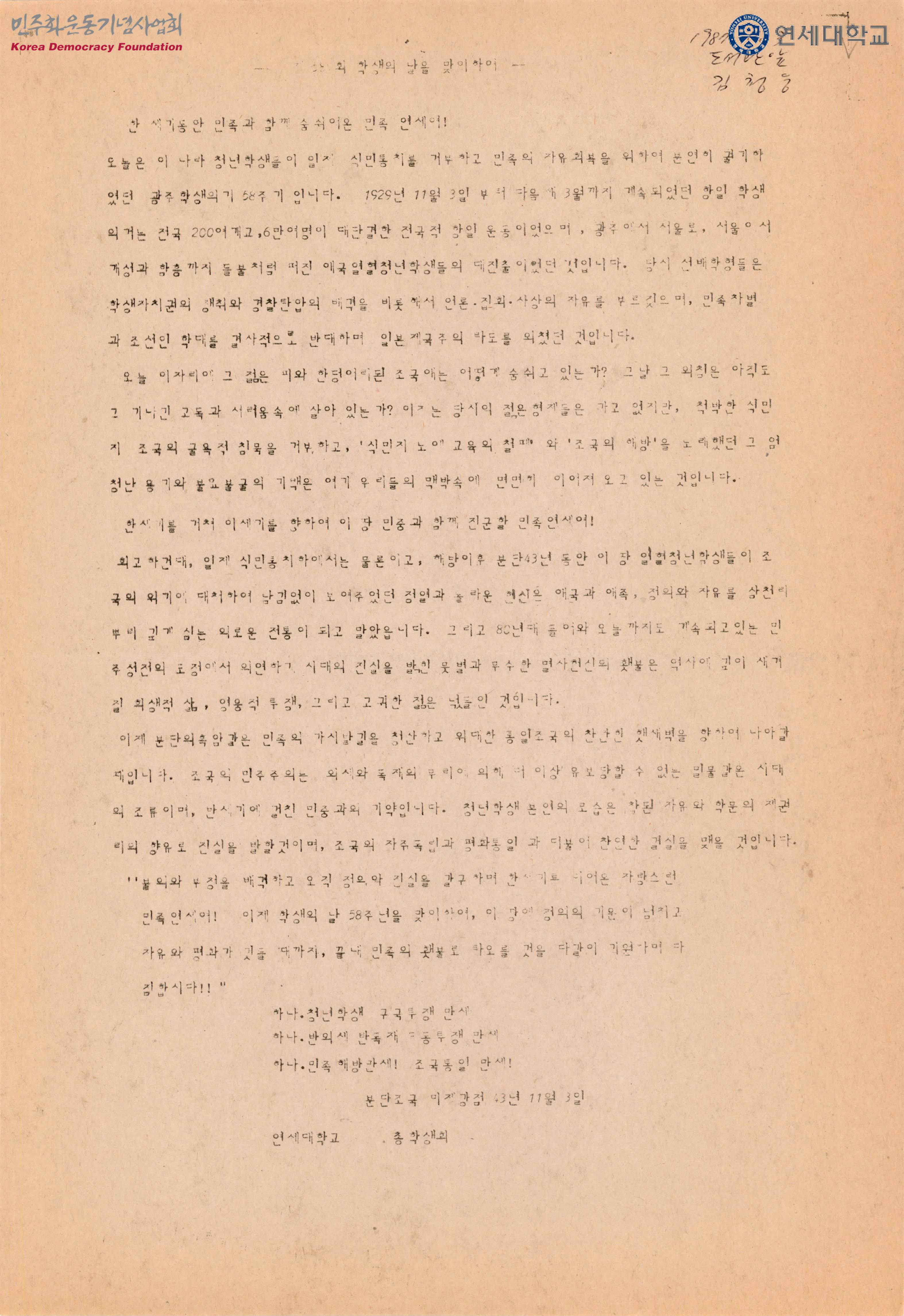 - 한국이 민주주의 쟁취를 통해 자주독립과 평화통일을 이룩하고, 학생들은 참된 자유와 학문의 재권리를 향유할 것이라는 내용의 유인물