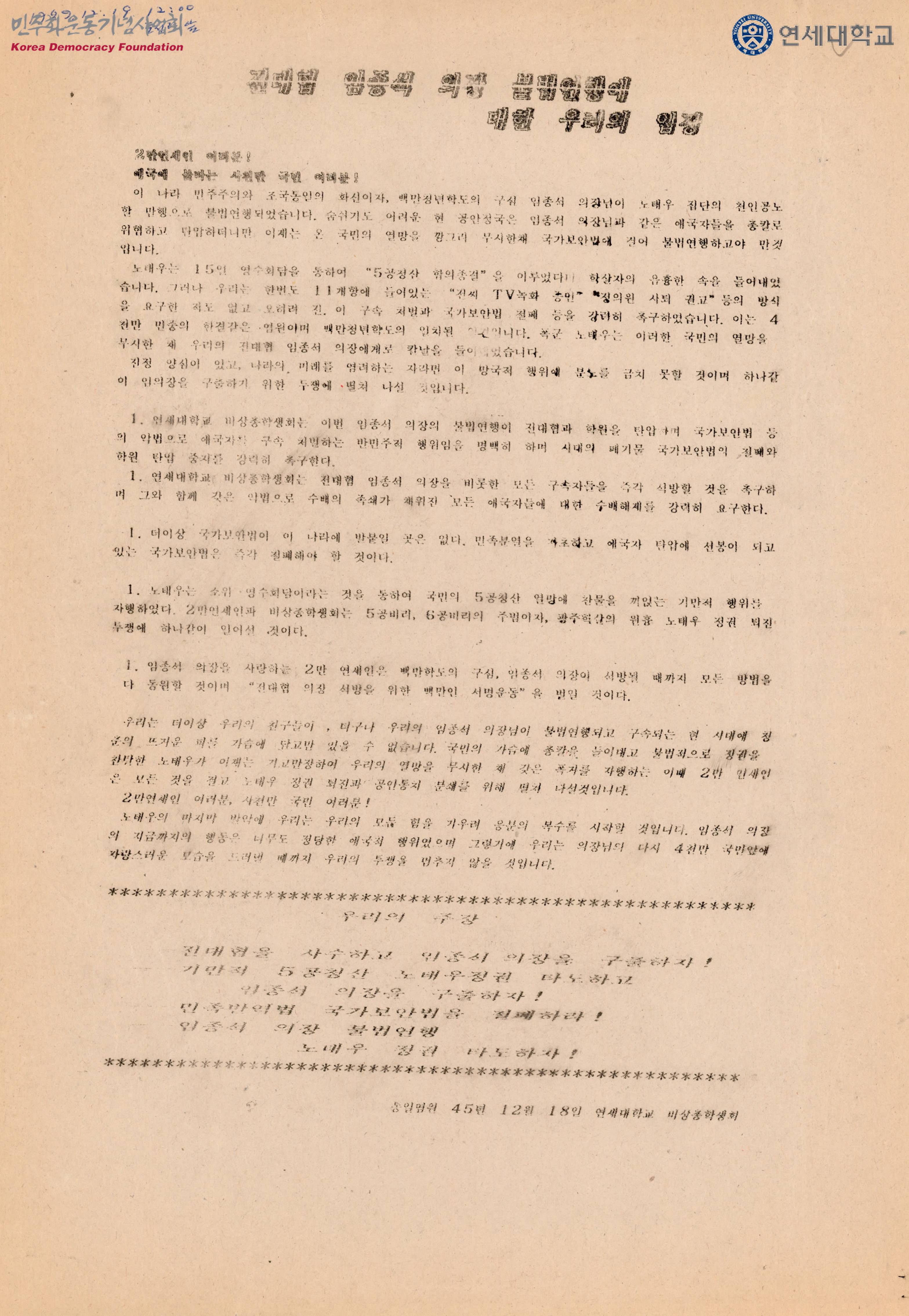 - 5공 청산에 대한 합의를 진행한 영수회담과 전대협 의장 임종석에 대한 불법연행을 규탄하며, 이에 대해 투쟁할 것을 선언하는 내용의 유인물