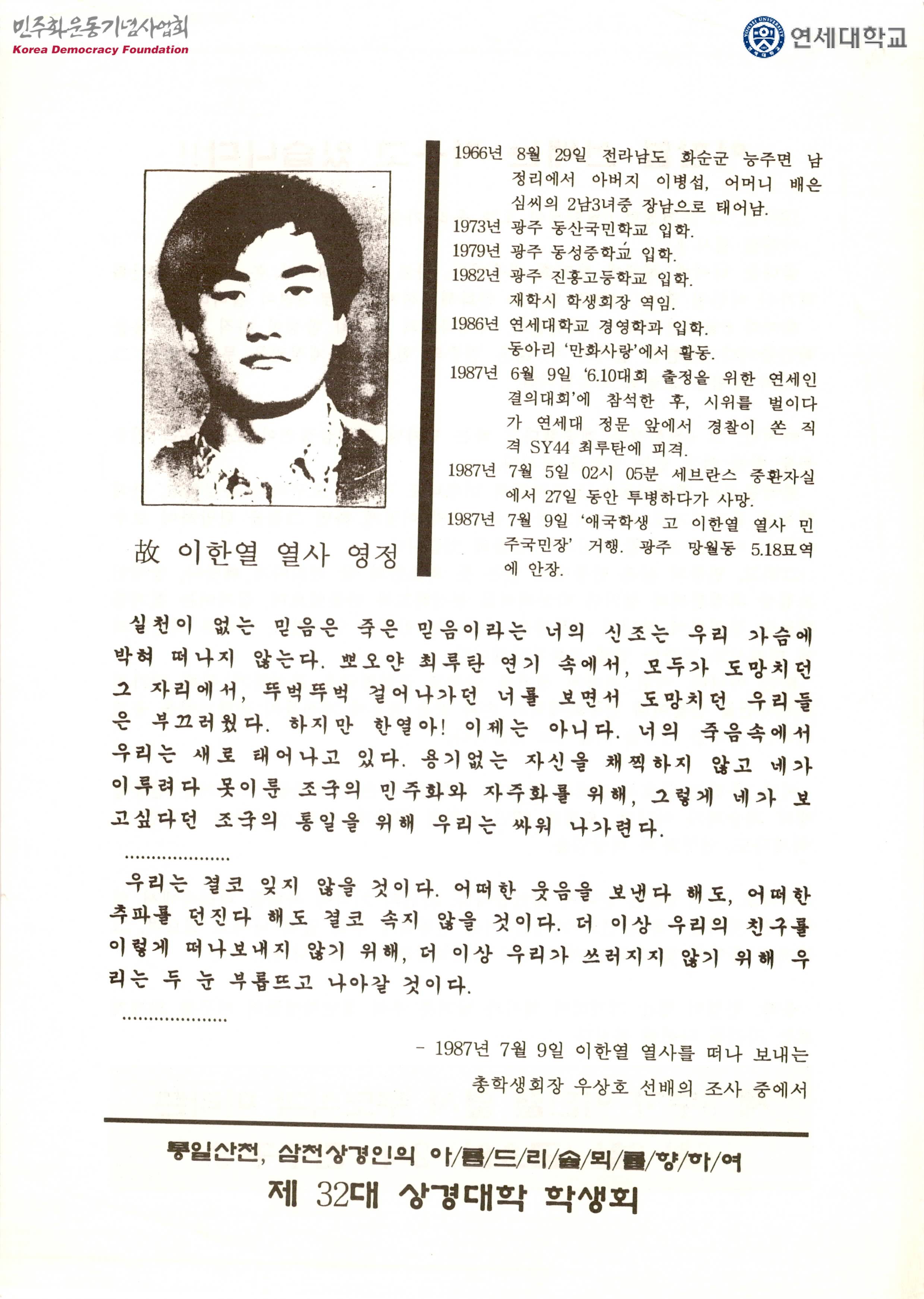 - 꽃다운 나이에 독재에 항거해 싸우다가 독재자의 최루탄에 산화한 이한열 열사의 8주년을 맞이해 그를 기억하며 역사가 남겨준 청년학생들의 의무를 되새겨 보는 자리를 마련해보자는 내용, 1987년 이한열 열사를 떠나보냈던 연세대학교 총학생회장 우상호 의 조사 등의 내용이 수록된 유인물