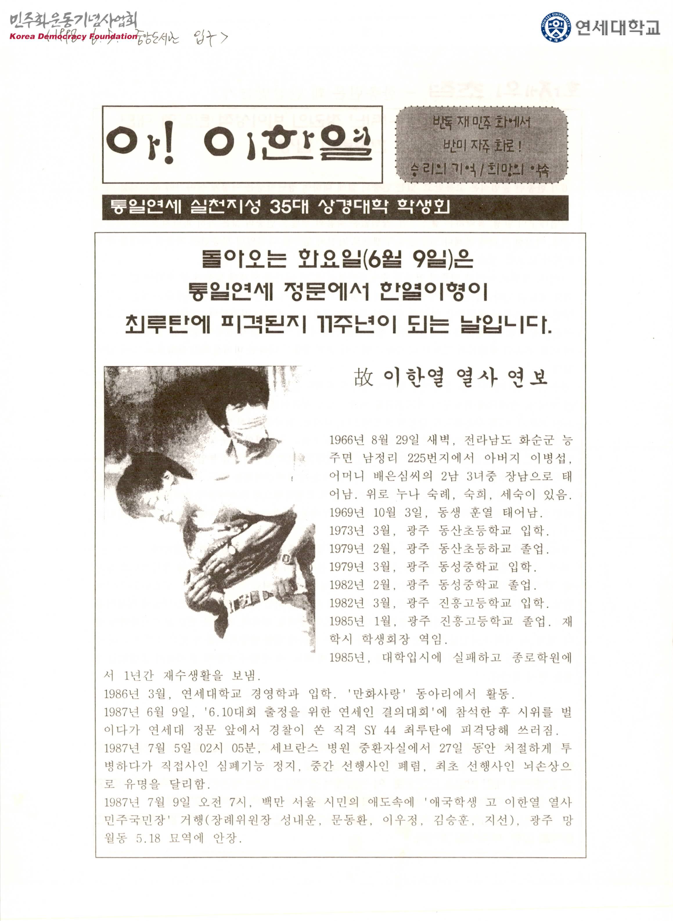 - 한총련은 정권의 반민주성, 폭력성, 반민중성, 외세의존성을 준엄하게 규탄하며, 한총련 출범식 과정에서 나타난 정권의 비이성적, 비상식적 탄압에 적극적으로 대처할 것이며 우리의 주장과 요구를 민중들과 함께 실현하는데 총력을 기울일 것이라는 내용, 고 이한열 열사의 연보 등이 수록된 유인물