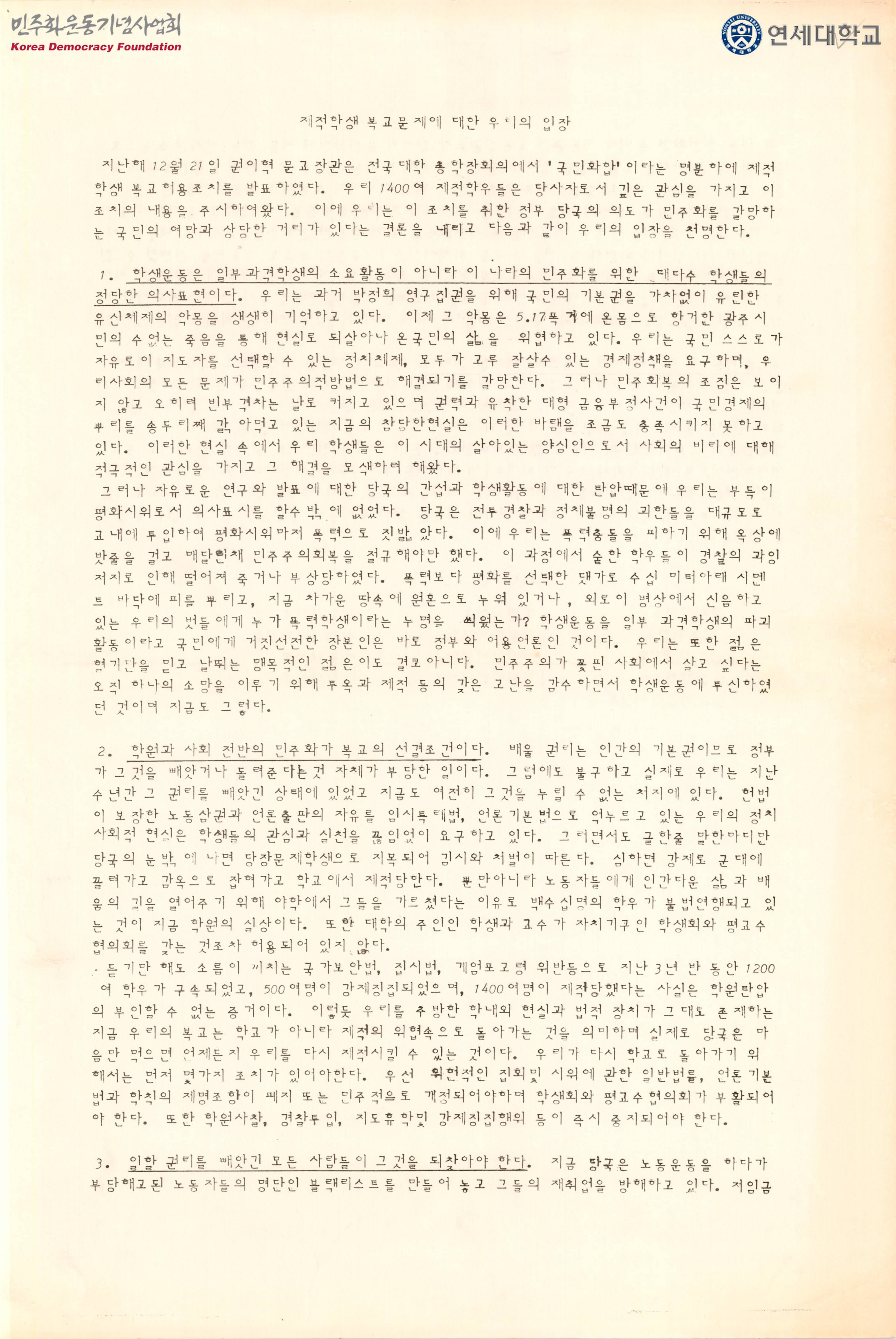 - 문교부장관이 '국민화합'이라는 명분하에 제적학생 복교허용조치를 발표하였으나, 이 조치를 취한 정부 당국의 의도가 민주화를 갈망하는 국민의 여망과 상당한 거리가 있다는 결론을 내리고 발표한 유인물로 내용은 다음과 같음 1. 학생운동은 일부과격학생의 소요활동이 아니라 이 나라의 민주화를 위한 대다수 학생들의 정당한 의사표현이다 2. 학원과 사회 전반의 민주화가 복교의 선결조건이다 3. 일할 권리를 빼앗긴 모든 사람들이 그것을 되찾아야 한다 4. 우리는 이 문제에 대해 공동으로 대처할 것이다