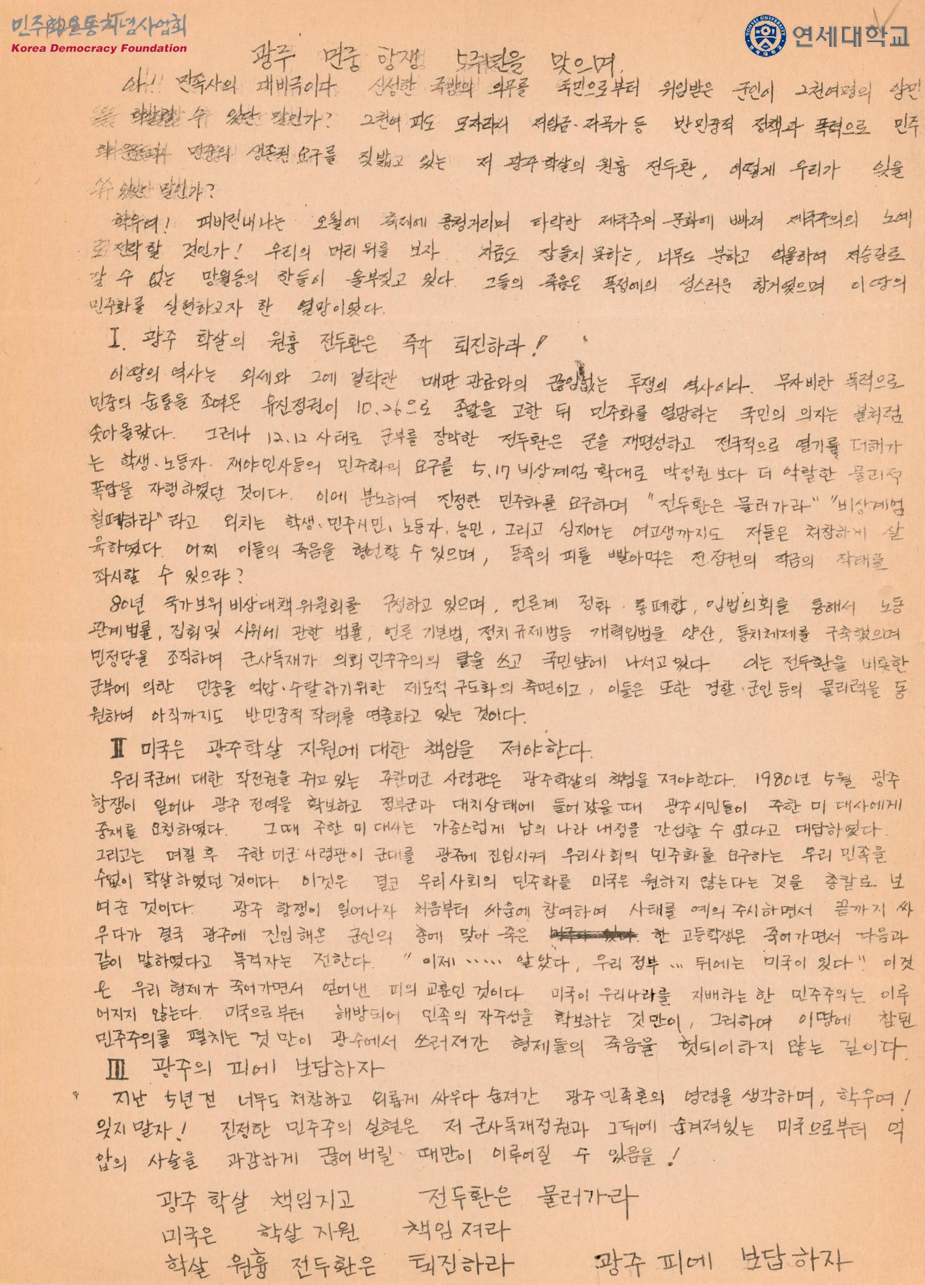 - 5.18민주화운동 5주기를 맞아 과거를 되돌아보며 광주 학살의 원흉인 전두환은 즉각 퇴진할것, 미국은 광주학살 지원에 대한 책임을 져아한다는것, 광주의 피에 보답하자는것에 대한 내용의 유인물