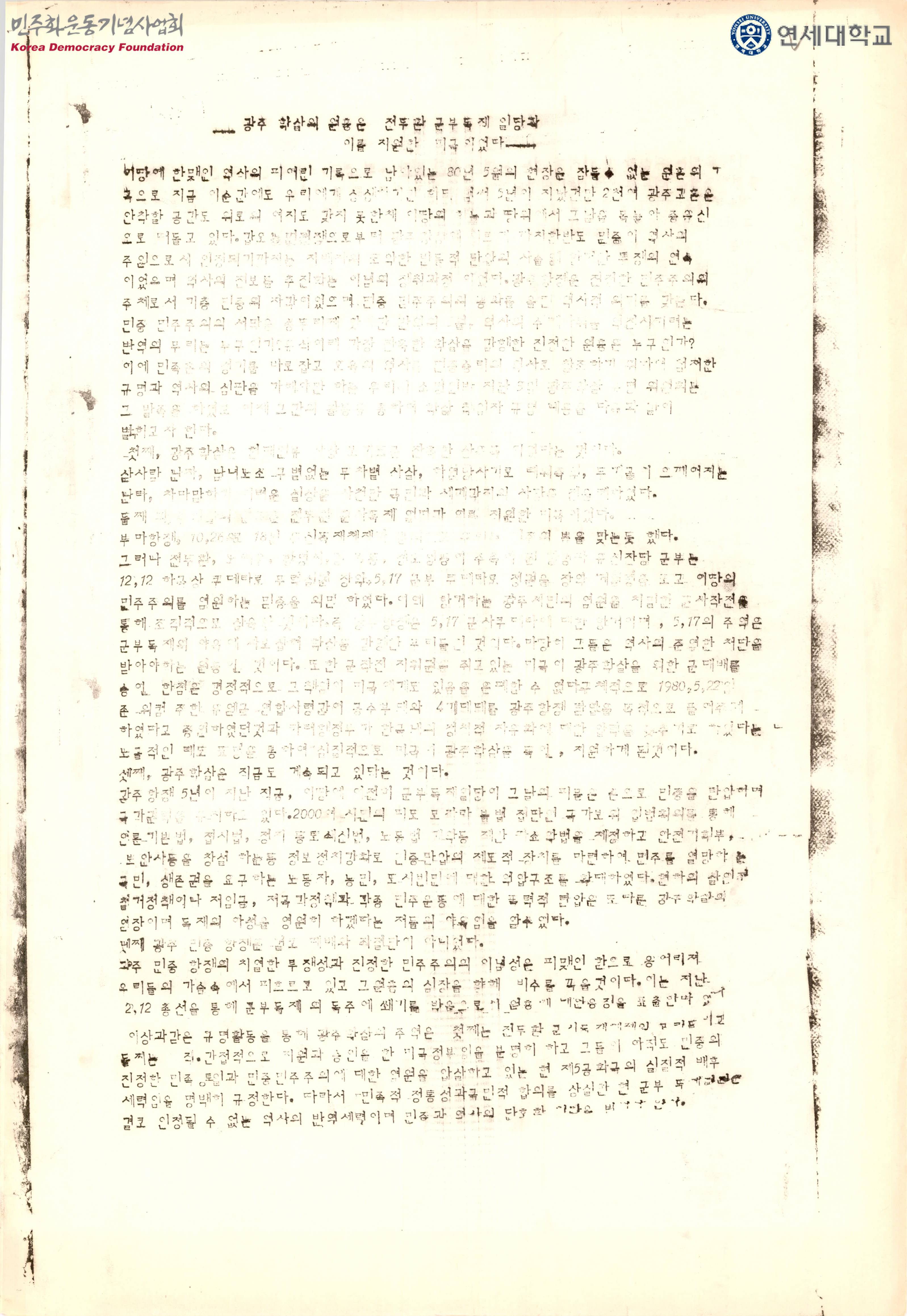 - 투쟁위원회는 전두환 정권에 대한 불퇴진의 진격을 멈추지 않을 것이며 민중해방과 민족통일, 민주주의를 기필코 쟁취하겠다는 내용의 유인물로 주장과 결의의 내용은 다음과 같음 - 국회는 국정조사권을 발동하여 진상을 철저히 규명하고 그 책임자를 즉각적으로 처단하라 - 미국은 광주학살에의 동의를 공개사과하고 군사독재에 대한 지지를 즉각 철회하라 - 학살집단인 일부 정치군부의 무리들과 민정당은 즉각 자폭하라 - 전두환은 학살원흉의 수괴로써 즉각 퇴진하고 민중의 준엄한 심판을 받아라 - 학살원흉과 모든 반동세력에 대한 우리의 단호한 처단의지를 타협할 수 없는 과감한 투쟁으로 보여주자