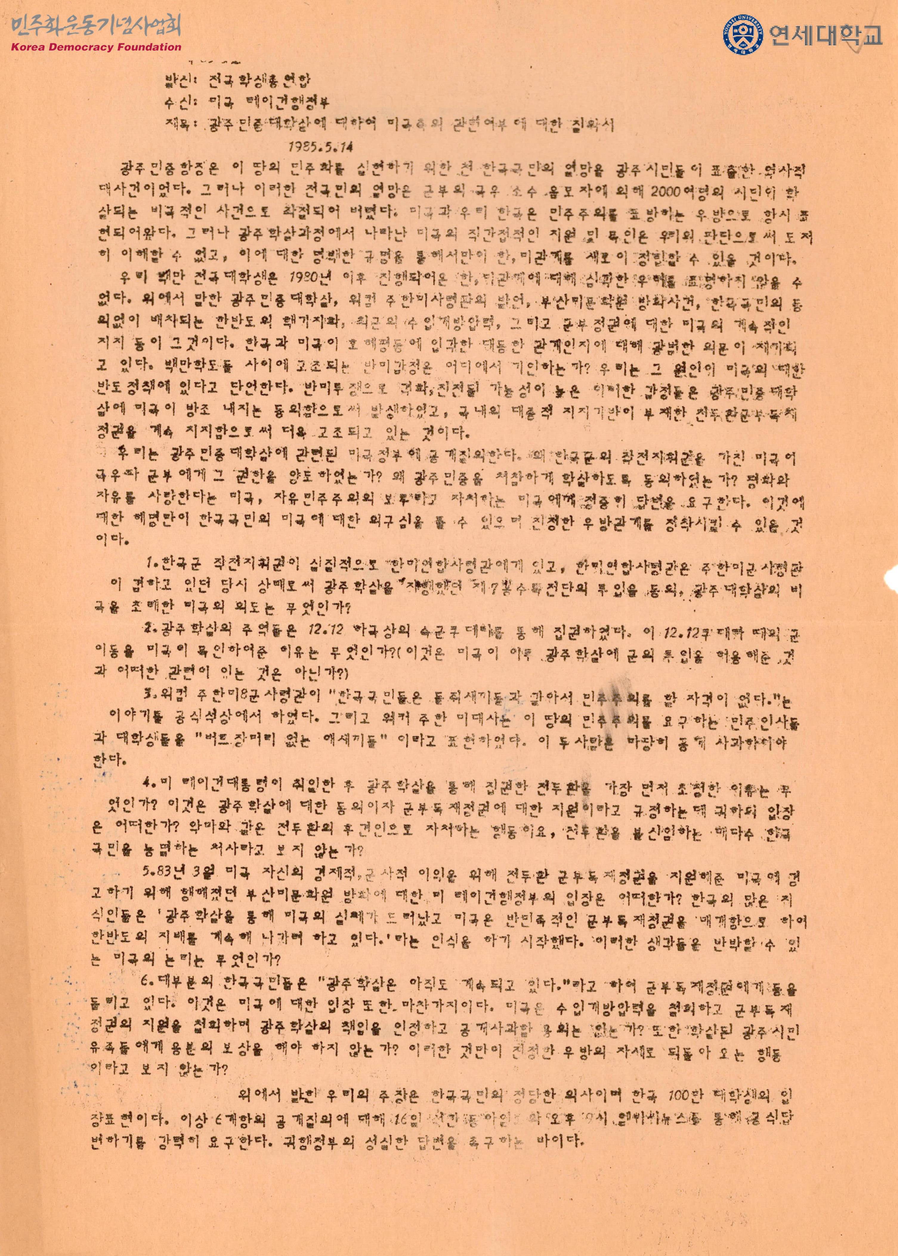 - 전학련에서 미국 레이건행정부에 보낸 광주민중대학살에 관련하여 미국정부에 질의한 내용이며 질의에 대한 해명만이 한국국민의 미국에 대한 의구심을 해결 할 수 있으며 진정한 우방관계를 정착시킬 수 있는 길이라는 내용의 유인물