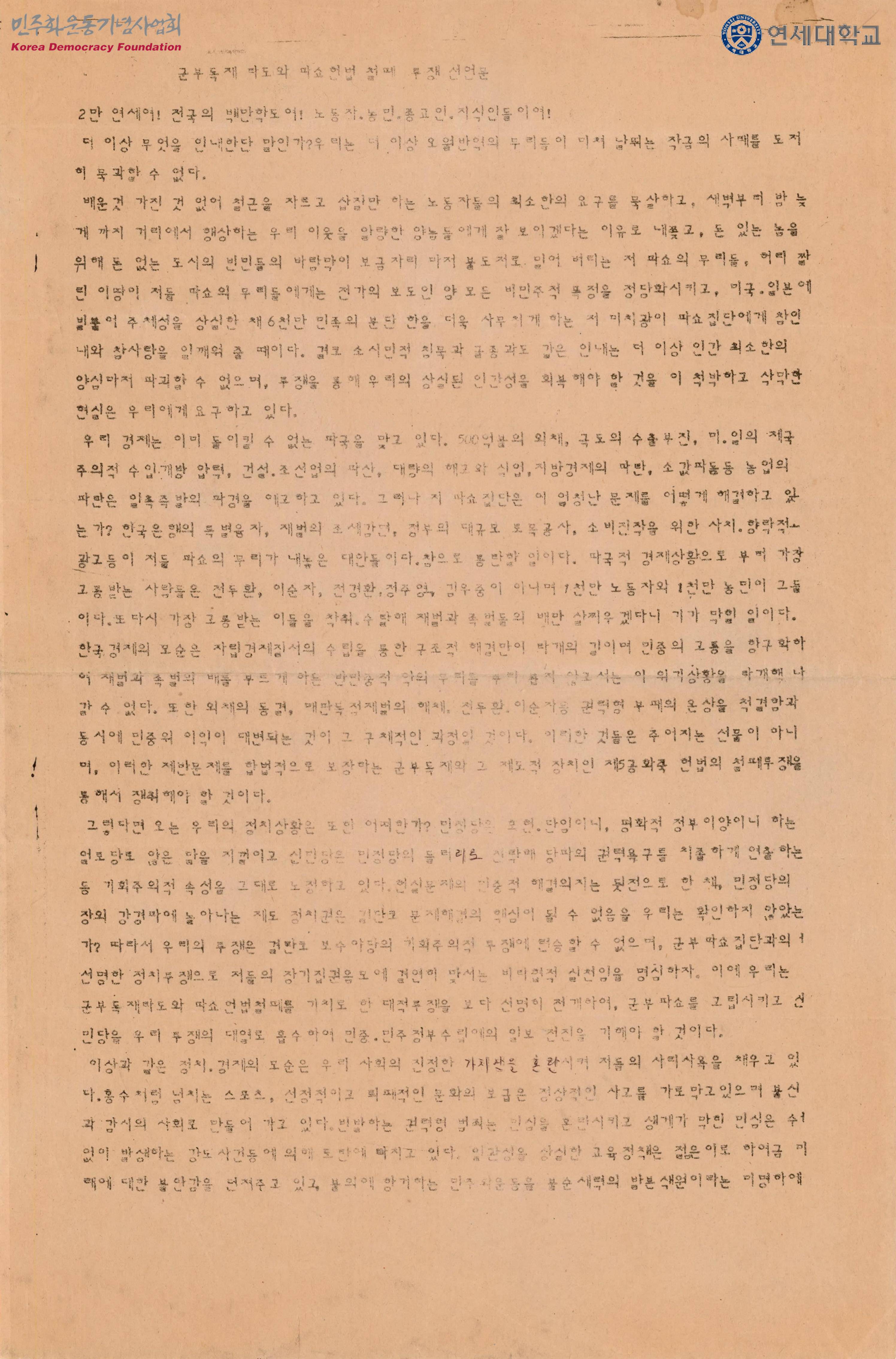- 정권의 작태를 군부독재최후발악으로 규정하고 더욱 더 철저한 투쟁을 통해 파쇼헌법을 철폐하고 군부독재정권을 응징할 것, 더 이상 좌시할 수 없으며 어떠한 희생을 치르더라도 기필코 군부독재 타도와 파쇼헌법을 철폐할 것이며 그를 위한 비타협적이고 선명한 대적투쟁을 전개할 것임을 선언하는 내용이 수록된 유인물로 선언문의 내용은 다음과 같음 첫째, 우리 민족과 민중의 참다운 삶이 실현되는 사회는 민족자주통일과 민중민주정부가 수립된 사회임을 재확인하며, 군부파쇼의 타도만이 진정한 해방의 출발임을 선언한다 둘째, 현재의 군부파쇼집단은 미국, 일본등 강대국의 원격조정에 의해 움직이는 꼭두각시 집단으로 규정하고 우리의 투쟁의 궁극은 회세의 배경에 있음을 선언한다 세째, 우리 투쟁의 현실적 전개과정은 정치, 경제, 사회등 모든 악의 총체적 제도장치인 제5공화국의 파쇼헌법 철폐를 위한 투쟁으로 집결되어 군부독재타도로 집중되어야 함을 선언한다
