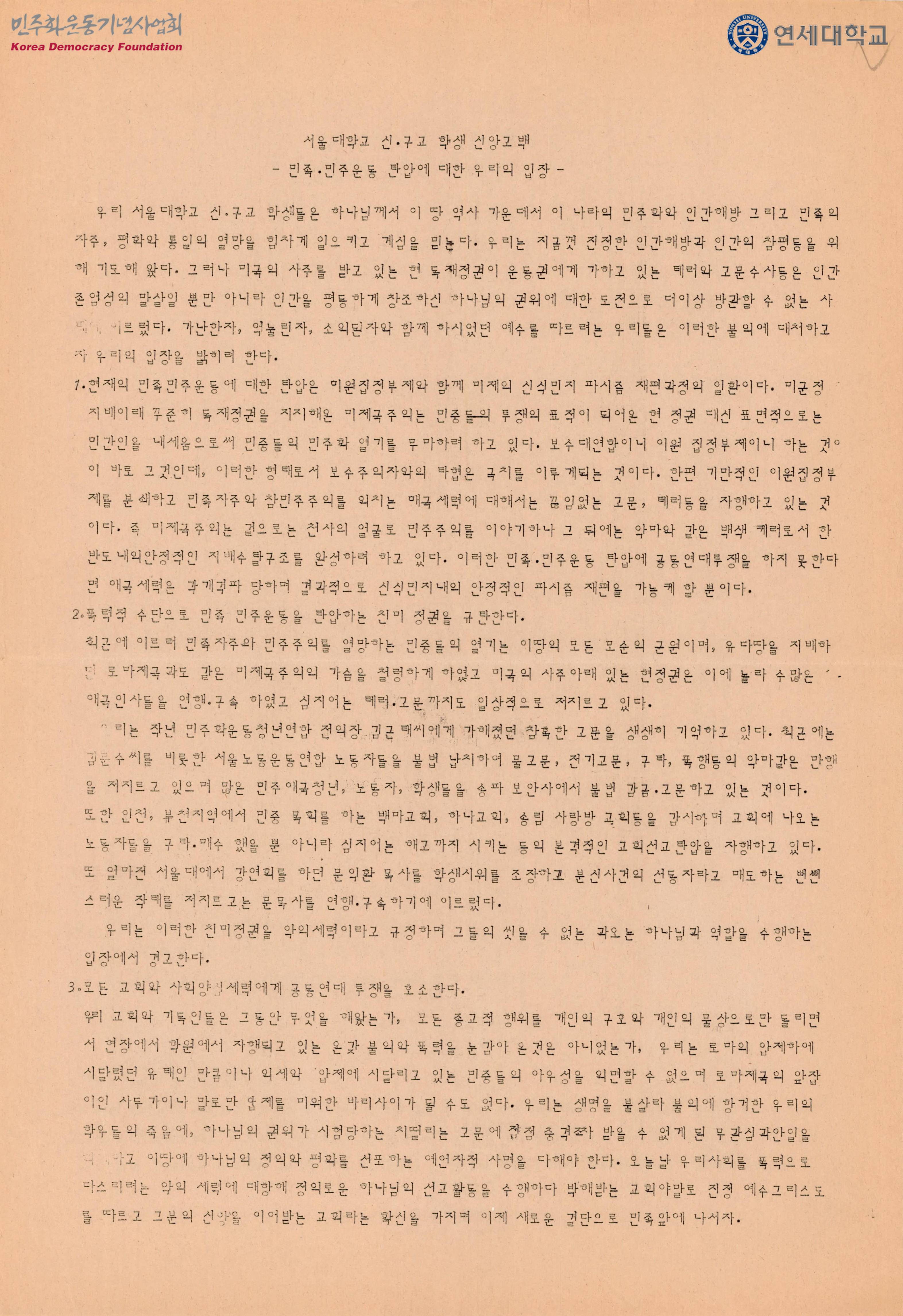 서울대학교 신 구교 학생 신앙고백 : 민족 민주운동 탄압에 대한 우리의 입장