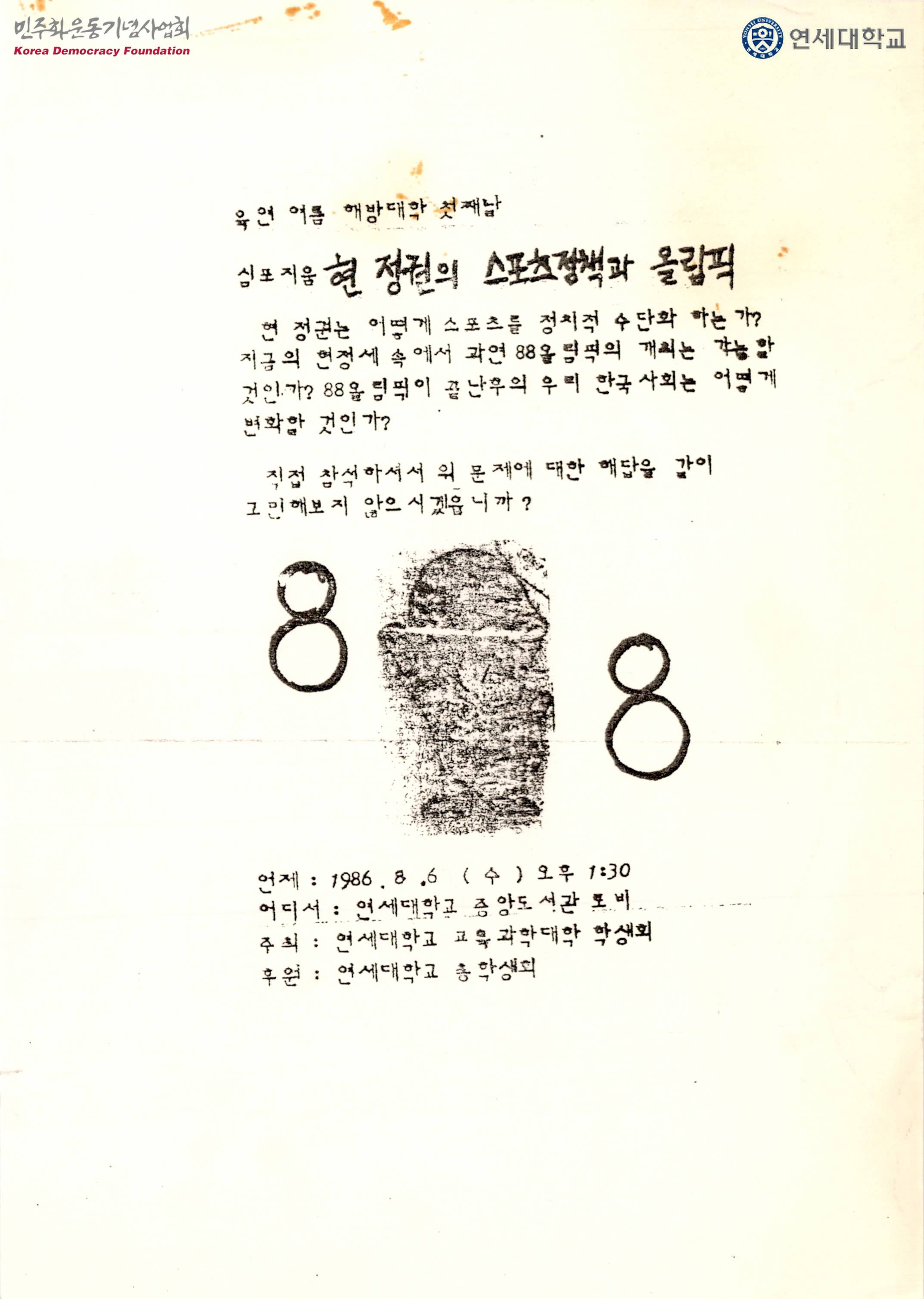 - 스포츠를 정치적 수단화하는 현 정세의 비판과 행사의 일시, 장소, 주최가 수록된 내용의 유인물