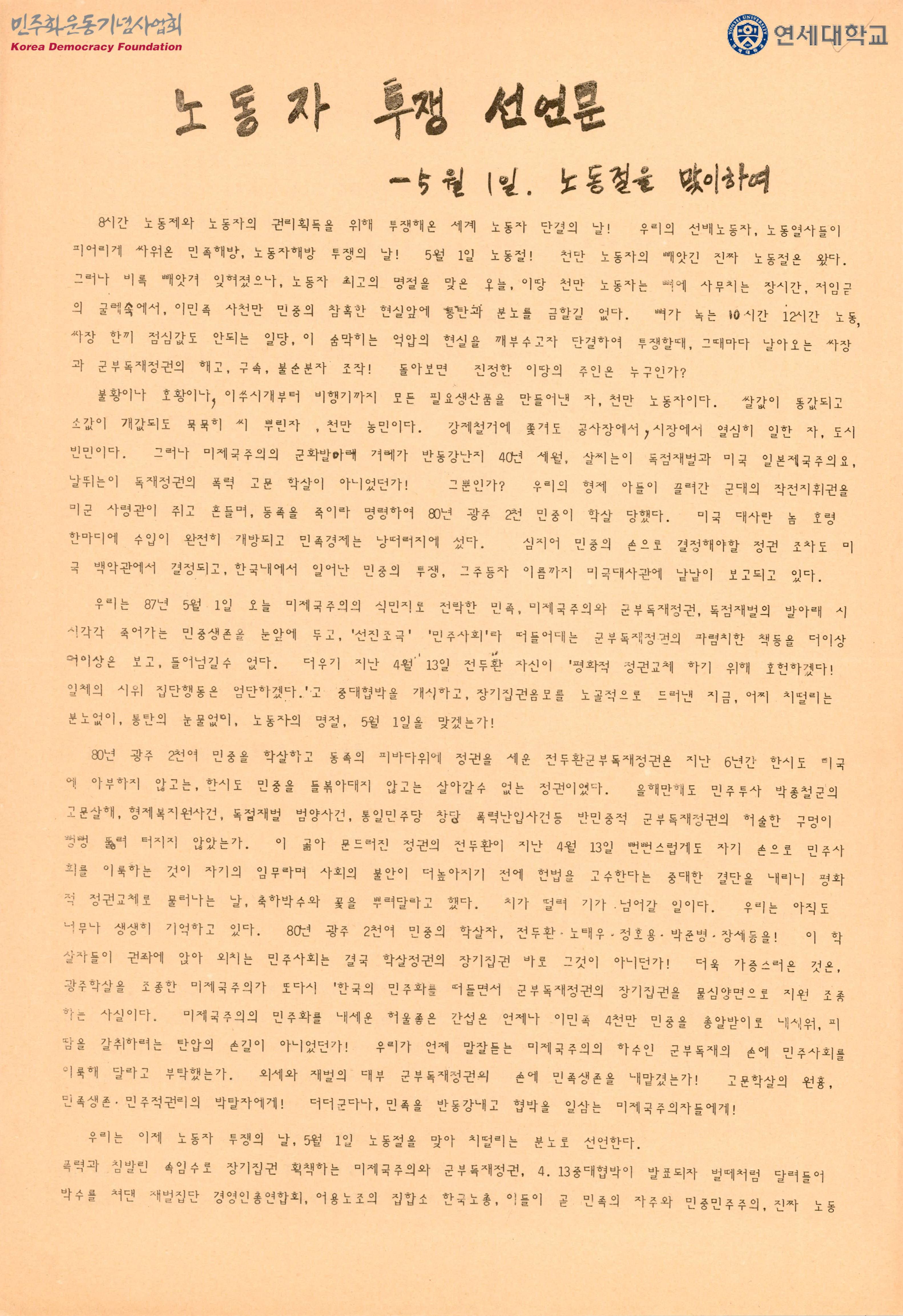 - 폭력과 침발린 속임수로 장기집권 획책하는 미제국주의와 군부독재정권, 4.13중대협박이 발표되자 박수치던 재벌집단 경영인총연합회, 어용노조의 집합소 한국노총, 이들이 민족의 자주와 민중민주주의 진짜 노동자들의 해방을 위해 싸워야할 민족 민중의 적임을 선언하는 내용의 유인물로 결의문의 내용은 다음과 같음 - 우리는 현재 눈앞에 벌어지는 미제국주의와 군부독재정권의 장기집권음모를 분쇄하고 이땅에 참된 민주주의를 이룩하는 그날까지 총력 투쟁할 것을 결의한다 - 우리는 군부독재 뒤에 숨어 독재정권을 지원 조종하는 미제국주의의 간교한 술책에 맞서 민족 자주화 투쟁의 선봉에 설 것을 결의한다 - 우리는 천만 노동자의 장시간 저임금 노동의 굴레를 깨부수고 8시간 노동만으로 생계가 보장되는 최저임금제 쟁취를 위해 대동단결 투쟁할 것을 결의한다 - 우리는 억압받는 이땅 민중 형제의 고통을 바로 천만 노동자의 고통으로 느끼며, 농민, 도시빈민, 청년 학생들의 모든 투쟁을 적극 지원 지지 연대해 나갈것을 결의한다