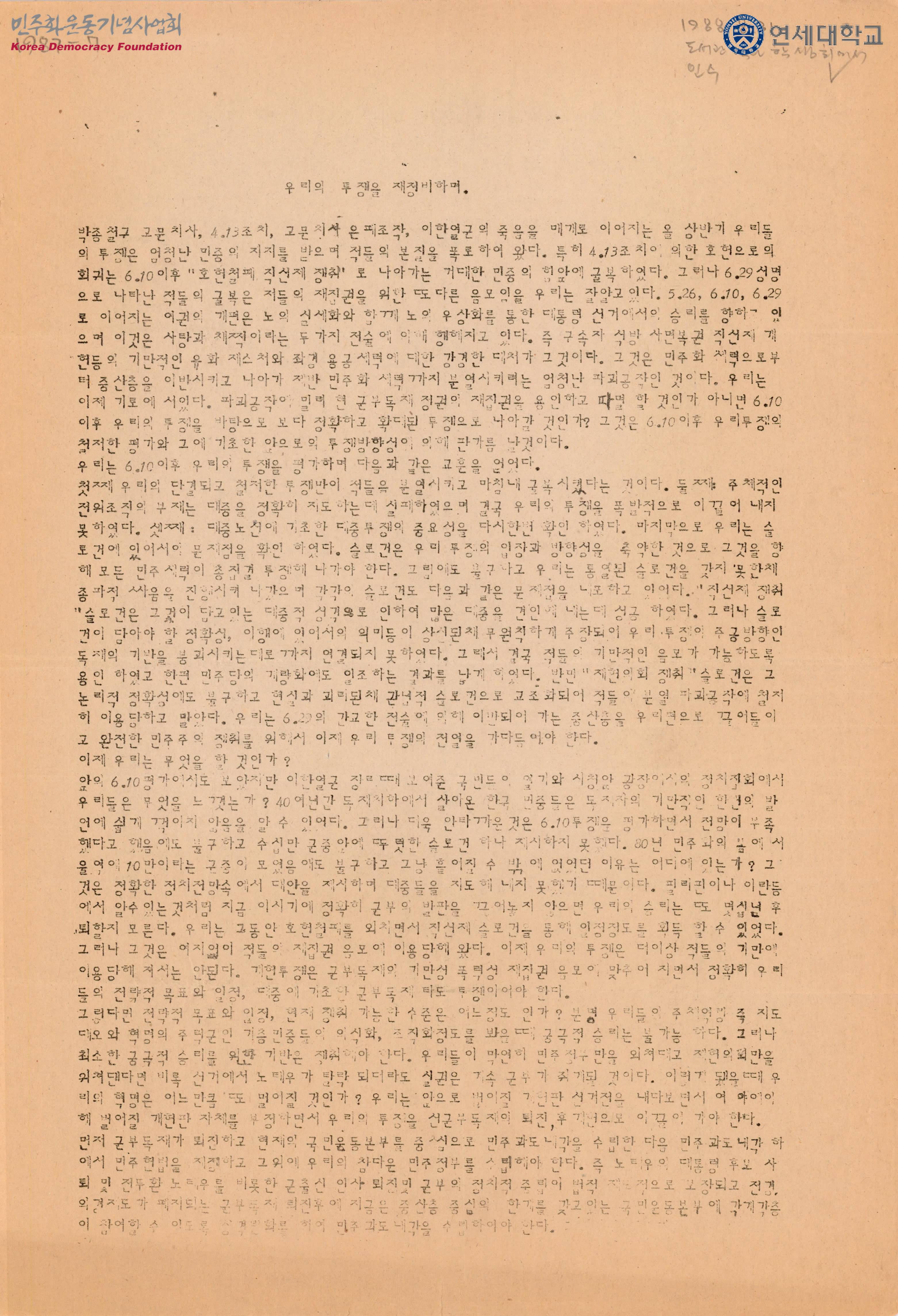 - 군부독재가 퇴진하고 현재의 국민운동본부를 중심으로 민주과도내각을 수립한 다음 민주과도내각 하에 민주헌법을 지정하고 이를 통에 참다운 민주정부를 수립해야 한다는 내용, 군출신 인사 퇴진 및 군부의 정치적 중립이 법적 제도적으로 보장되고 전경, 의경제도가 폐지되는 군부독재 퇴진 후 민주과도내각을 수립하여야 한다는 내용의 유인물