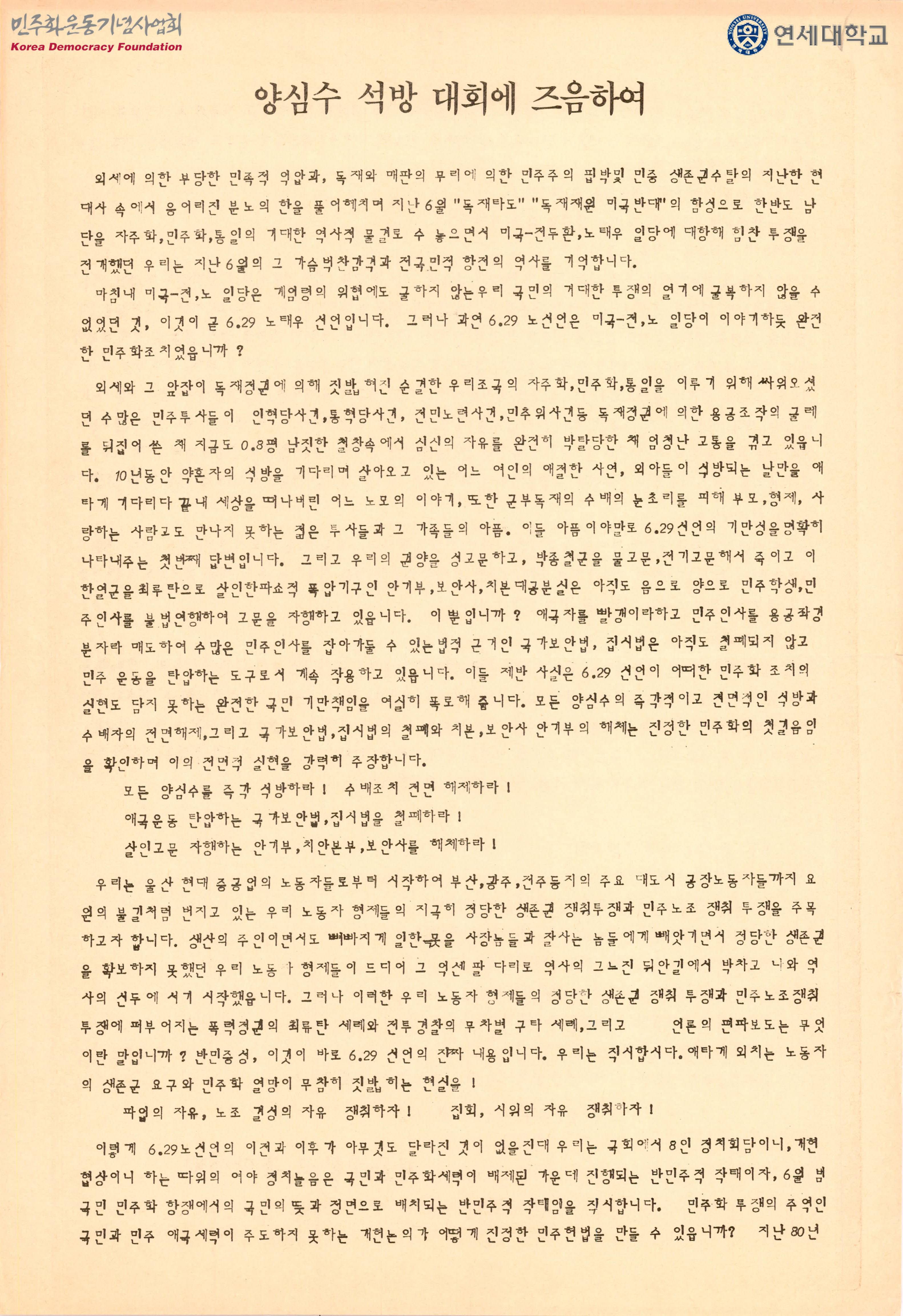 - 기본적인 민주제권리 쟁취 투쟁에대해 모든 민주화 세력과 국민들은 아낌없는 지원과 연대, 그리고 국민과 믽화 세력이 배제된 개헌 협상과 이후의 기만적 정치 일정에 대해 주목하면서, 우리 국민과 민주화 세력이 우리의 손으로 정당하게 자주적인 민주정부를 수립하기 위해, 광주학살 주범 전두환, 노태우 일당의 권력으로부터 즉각적 퇴진속에서 그리고 미국의 독재지원, 내정간섭이 제제된 가운데 모든 민주 애국 세력이 모여 범국민 과도 민주 정부를 구성해야함을 주장하는 내용의 유인물로 주장은 다음과 같음 - 모든 양심수를 즉각 석방하라! - 수배조치 전면 해제하라! - 애국운동 탄압하는 국가보안법, 집시법을 철폐하라! - 살인고문 자행하는 안기부, 보안사, 치안본부 해체하라! - 파업의 자유, 노조 결성의 자유 쟁취하자! - 언론, 출판, 집회 시위의 자유 쟁취하자! - 학살원흉과 타협없다, 민주당은 투쟁하라! - 독재유지 타협종용 미국은 물러가라! - 광주학살주범 전두환, 노태우 일당 몰아내고 과도 민주 정부 수립하자!