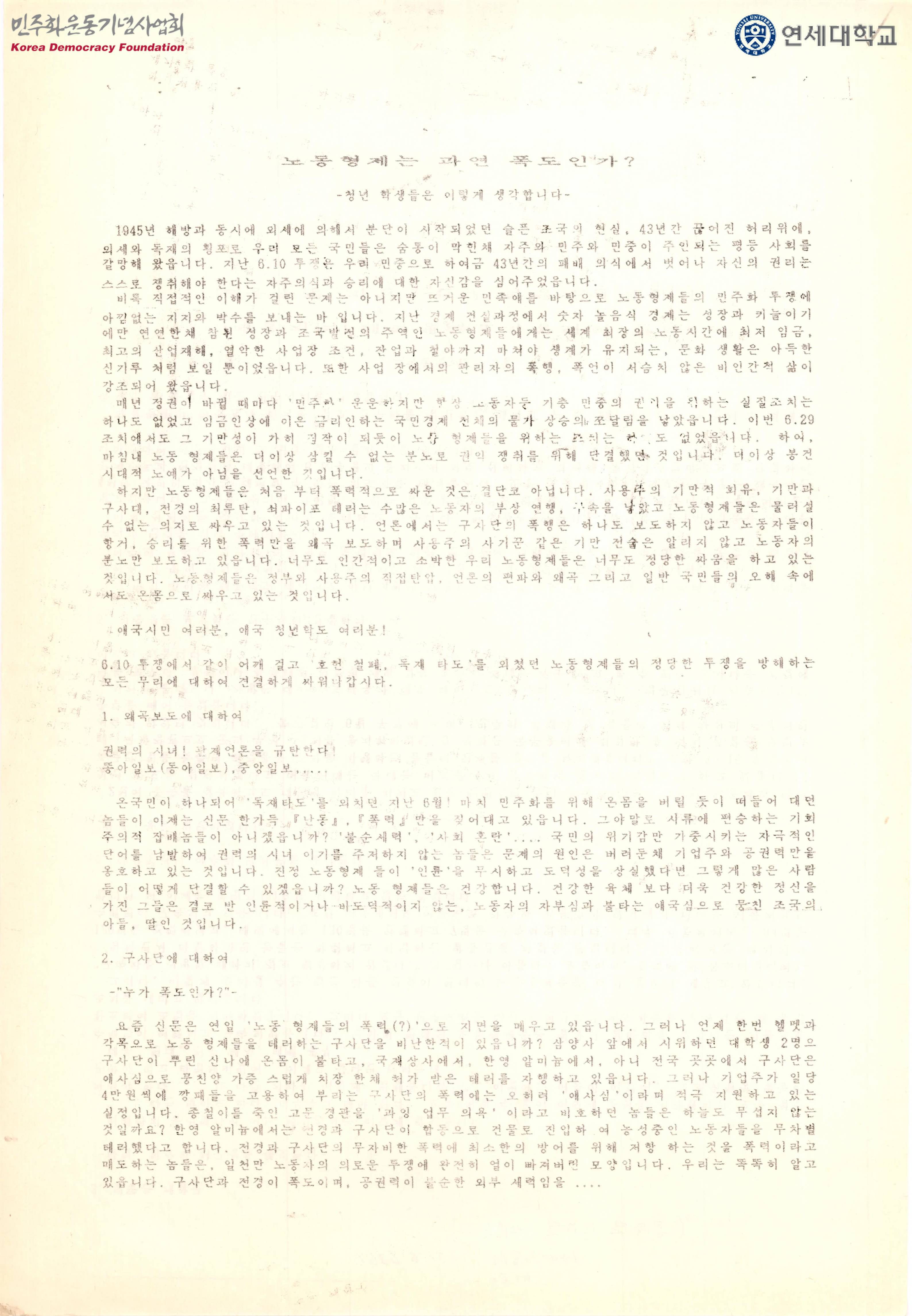- 정권이 바뀔 때마다 '민주화'를 운운하지만 항상 노동자등 기층 민중의 권리를 위하는 실질조치는 하나도 존재하지 않았고 임금인상에 이은 금리인하는 국민경제 전체의 물가 상승을 야기하였으며, 이번 6.29조치에서도 그 기만성이 가히 짐작이 되듯이 노동 형제들을 위하는 조치는 없었기에 노동자들은 더 이상 삼킬 수 없는 분노로 권익 쟁취를 위해 단결한 것이고 봉선시대적 노예가 아님을 선언한 것이라는 내용이 수록된 유인물