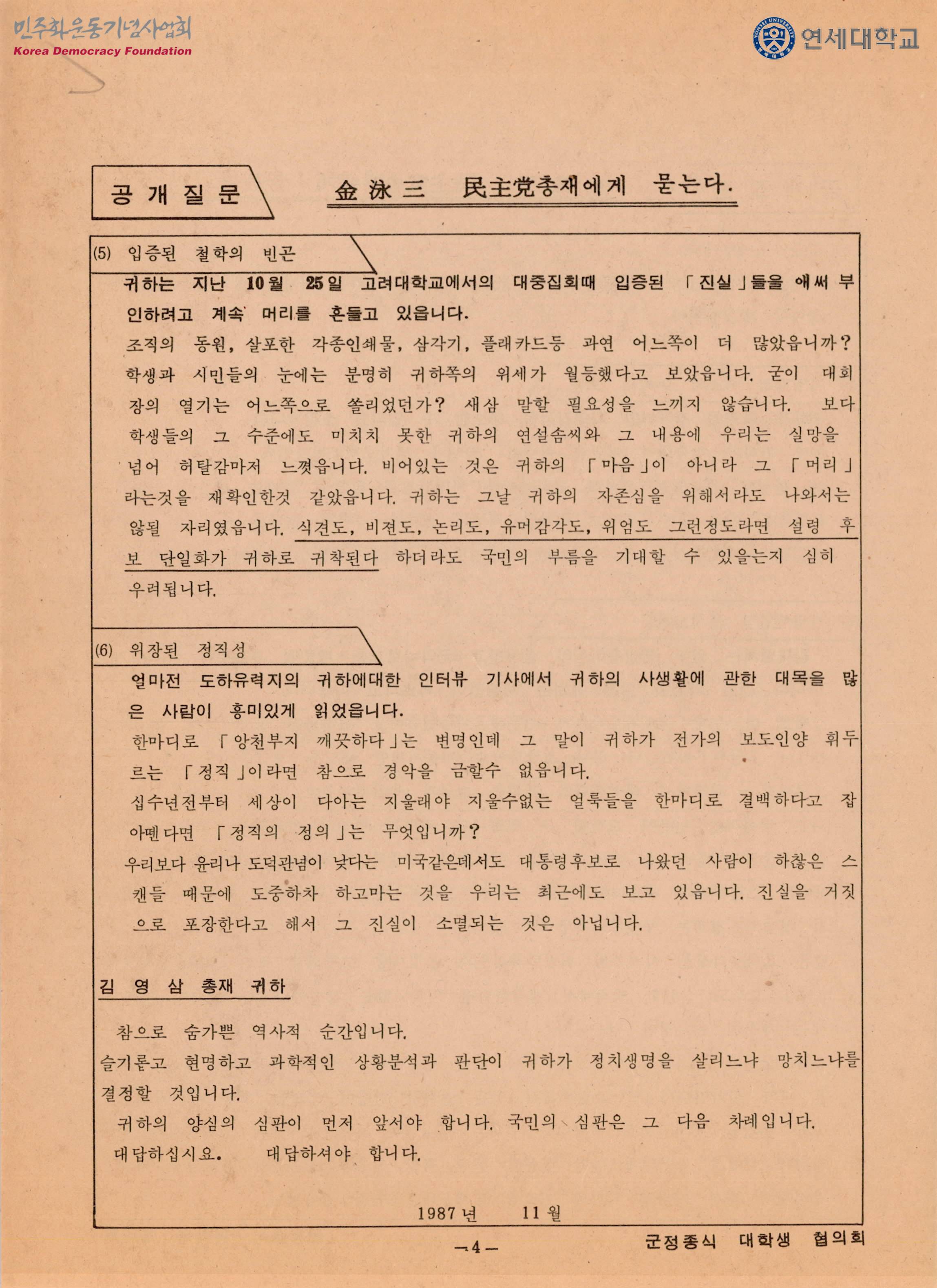 공개질문 : 金泳三 民主黨 총재에게 묻는다