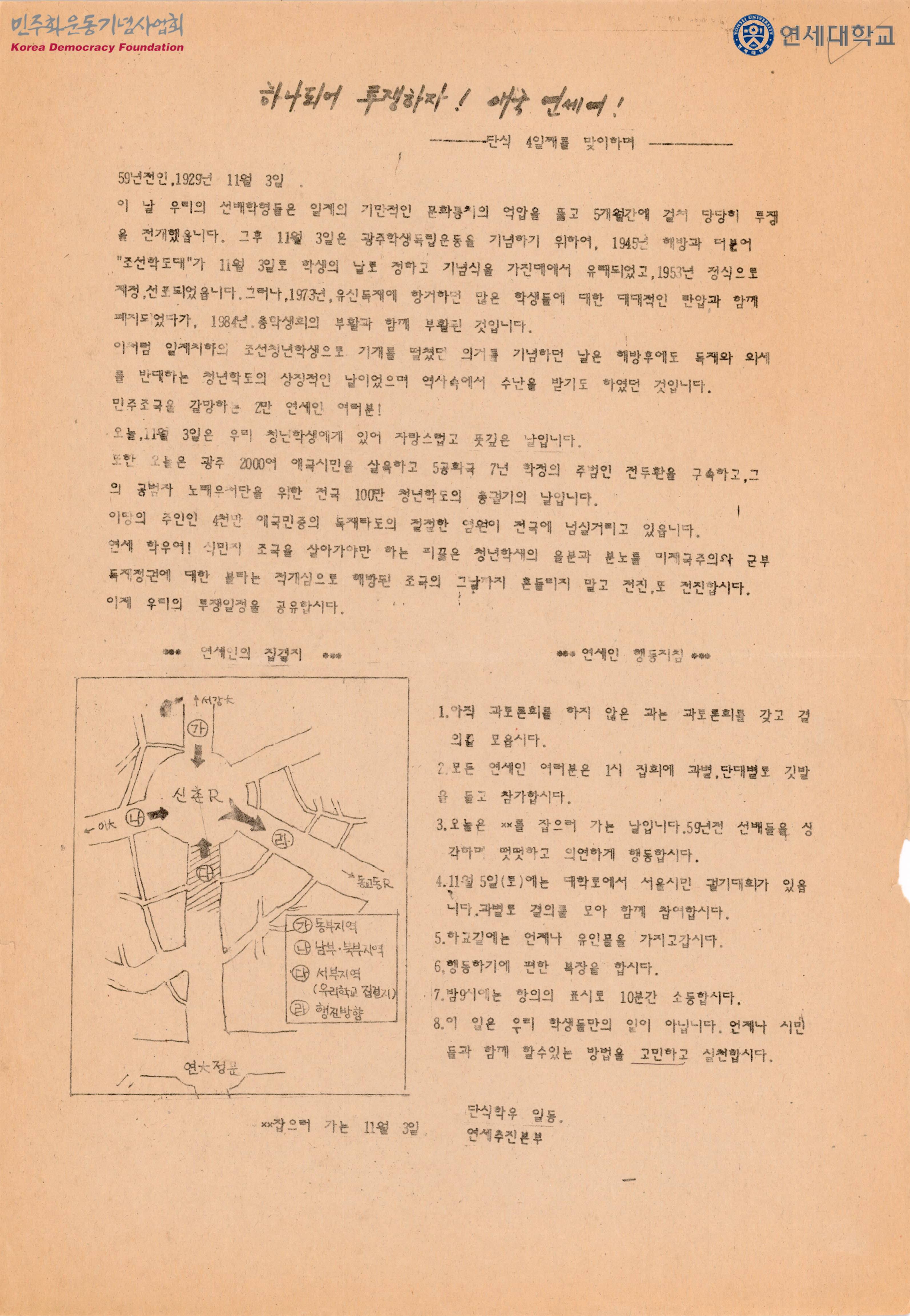 - 11월 3일은 청년학생에게 있어 자랑스럽고 뜻깊은 날이며 이날은 광주 2,000여명의 애국시민을 살육하고 5공화국 7년 학정의 주범인 전두환을 구속하고, 그의 공범자 노태우처단을 위한 전국 100만 청년학도의 총궐기로써 투쟁하자는 내용의 유인물