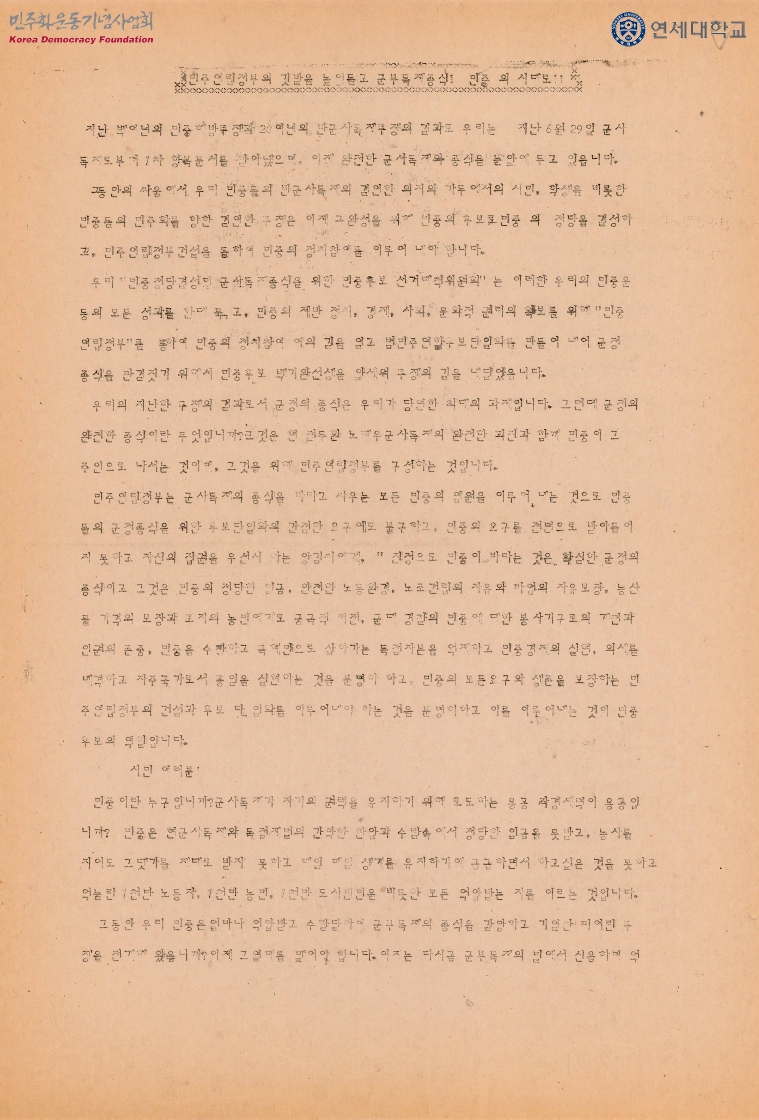 민주연립정부의 깃발을 높이들고 군부독재종식! 민중의 시대로!!