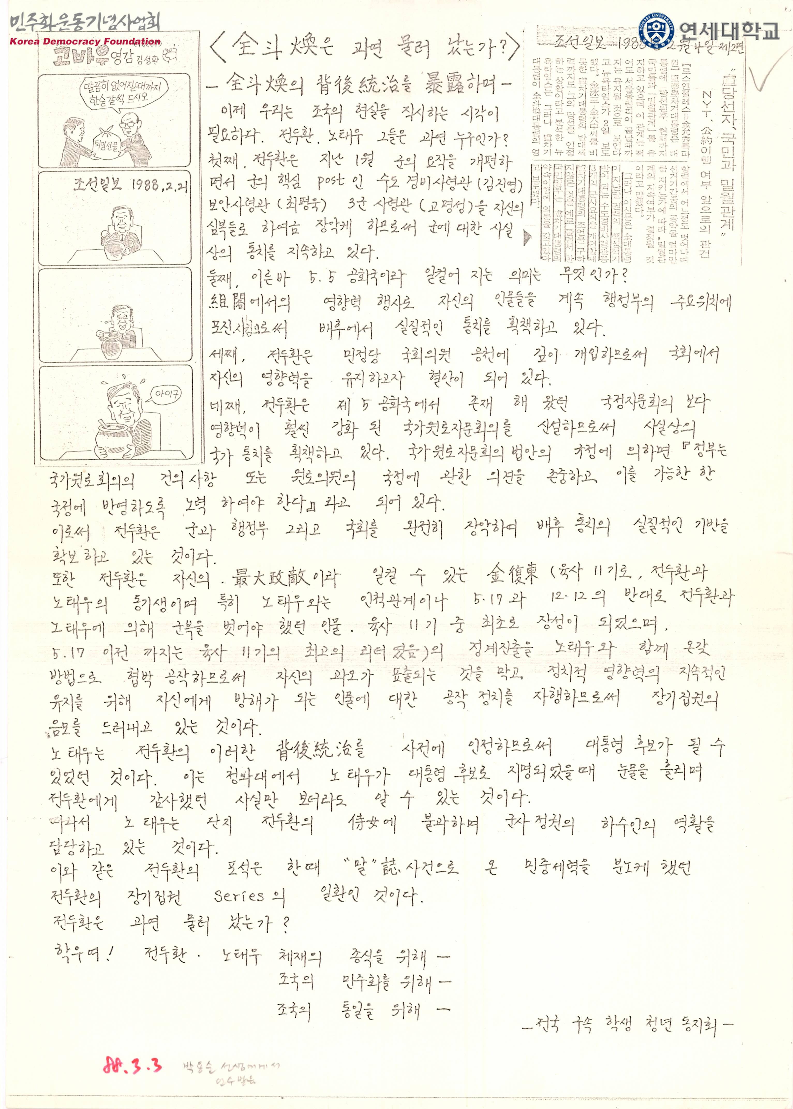 - 전두환의 배후통치를 폭로하며, 전두환은 자신의 최대정적이라 말할 수 있는 김복동의 정계진출을 노태우와 함께 온갖 방법으로 협박 공작하여 자신의 과오가 표출되는 것을 막고 정치적 영향력의 지속적인 유지를 위해 공작정치를 자행하여 장기집권의 음모를 드러내고 있는 것이라는 내용, 노태우는 전두환의 이러한 배후통치를 사전에 인정하여 대통령 후보가 될 수 있었고 노태우는 단지 전두환의 시녀에 불과하며 군사정권의 하수인의 역할을 담당하고 있는 것이라는 내용이 수록된 유인물