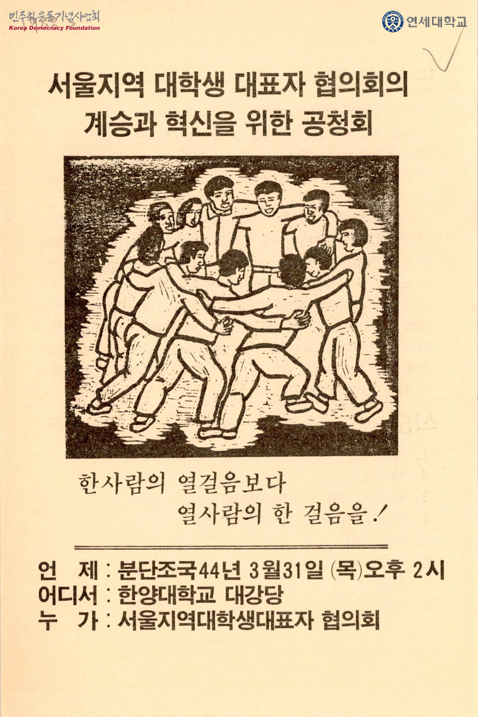 - 공청회의 일시, 장소, 주최가 수록된 내용, 6.29이후 대통령선거투쟁 과정에 이르기까지 과연 여러분의 지혜와 뜻과 힘을 받들어 진정 청년학생여러분께 봉사하려는 원칙을 철저히 했는가를 냉철히 평가, 반성해야하는 자리를 만들었다는 내용이 수록된 유인물로 목차는 다음과 같음 1. 개회 2. 애국의례 3. 인사(각 대학 신임 총학생회장단) 4. 발제 5. 문화놀이 6. 질문과 응답 7. 결의 8. 폐회