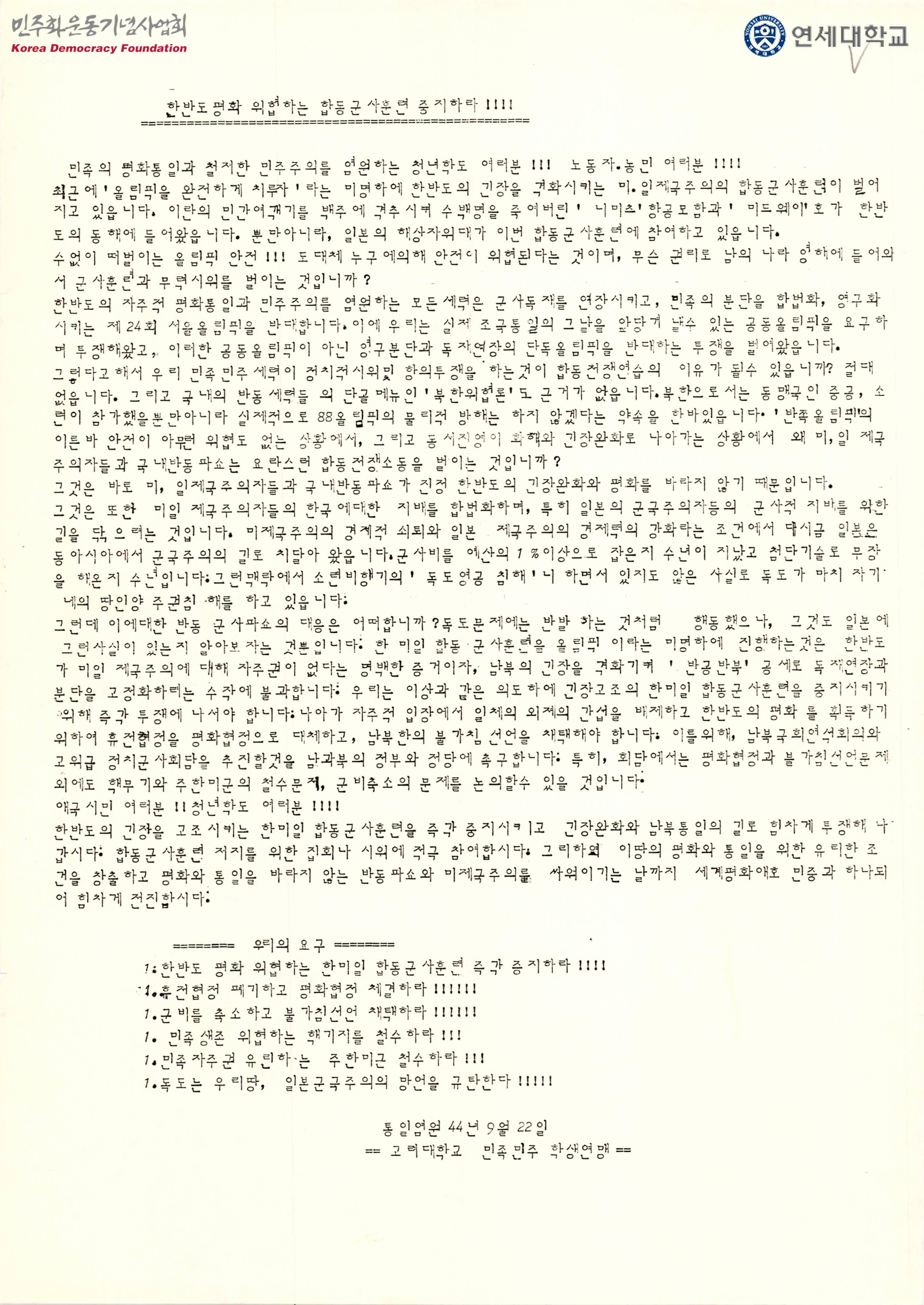 - 한반도의 긴장을 고조시키는 한미일 합동군사훈련을 즉각 중지시키고 긴장완화와 남북통일의 길로 힘차게 투쟁해 나가며 합동군사훈련 저지를 위한 집회나 시위에 적극 참여하자는 내용, 그리하여 이땅의 평화와 통일을 위한 유리한 조건을 창출하고 평화와 통일을 바라지 않는 반동파쇼와 미제국주의를 싸워 이기는 날까지 세계평화애호민중과 하나되어 전진하자는 내용이 수록된 유인물로 요구사항은 다음과 같음 - 한반도 평화 위협하는 한미일 합동군사훈련 즉각 중지하라!!!! - 휴전협정 폐기하고 평화협정 체결하라!!!!!! - 군비를 축소하고 불가침선언 채택하라!!!!!! - 민족생존 위협하는 핵기지를 철수하라!!! - 민족자주권 유린하는 주한미군 철수하라!!! - 독도는 우리땅, 일본군국주의의 망언을 규탄한다!!!!!