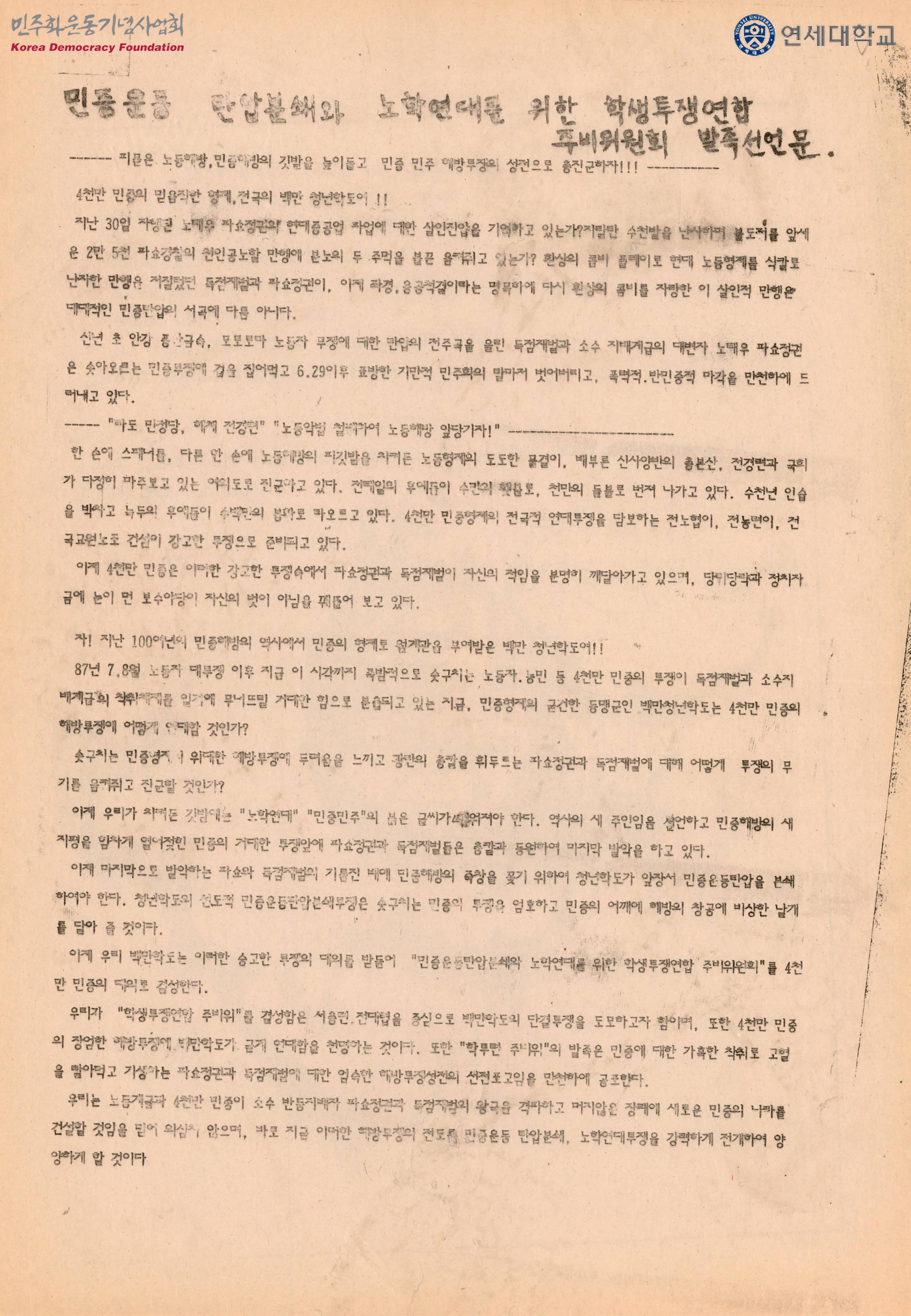 민중운동 탄압분쇄와 노학연대를 위한 학생투쟁연합 준비위원회 발족선언문