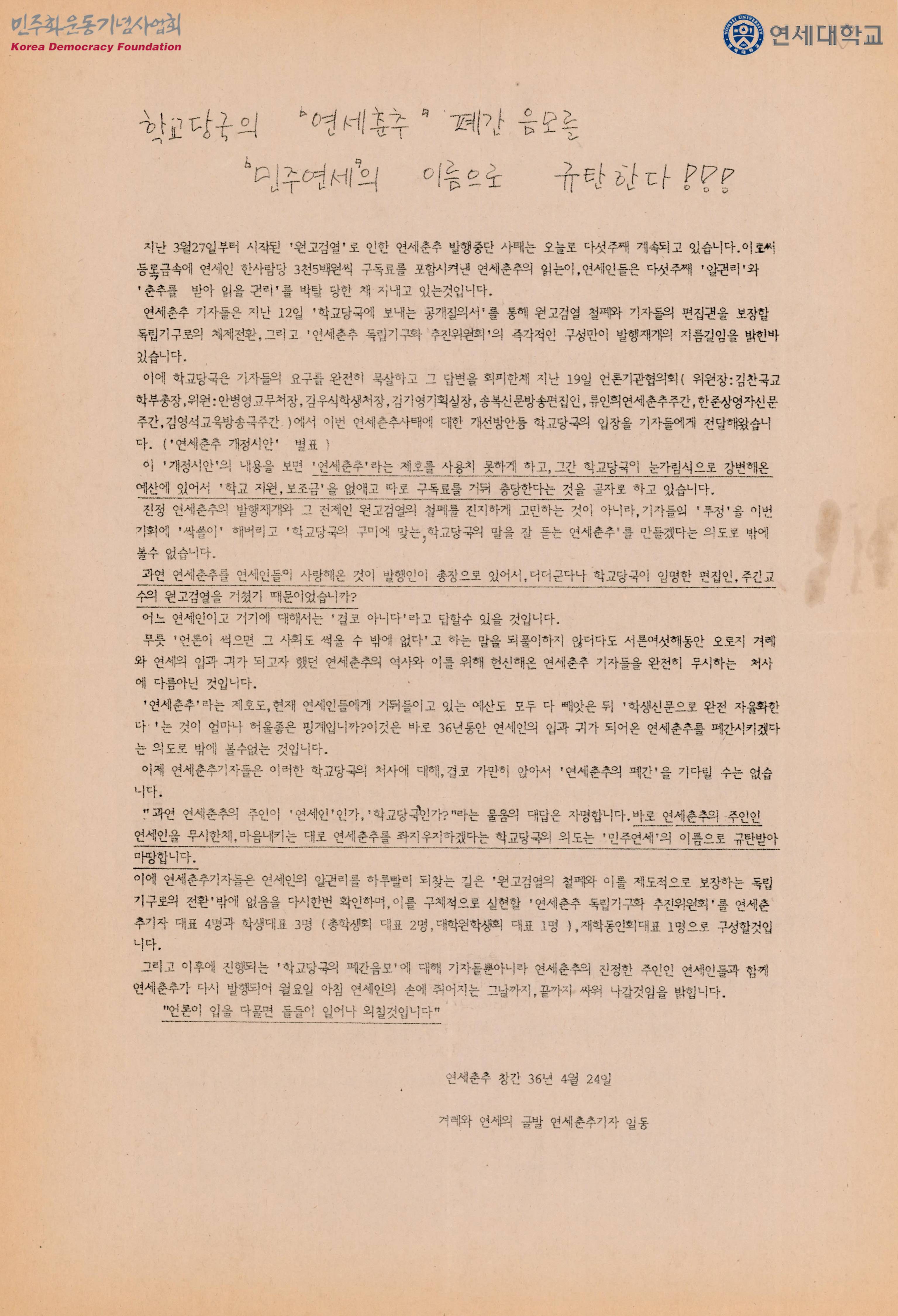 - 연세춘추기자들은 연세인의 알권리를 하루빨리 되찾는 길은 '원고검열의 철폐와 이를 제도적으로 보장하는 독립기구로의 전환'밖에 없음을 다시한번 확인하며, 이를 구체적으로 실현할 '연세춘추 독립기구화 추진위원회'를 연세춘추기자 대표 4명과 학생대표 3명, 재학동인회대표 1명으로 구성할것이라는 내용이 수록된 유인물