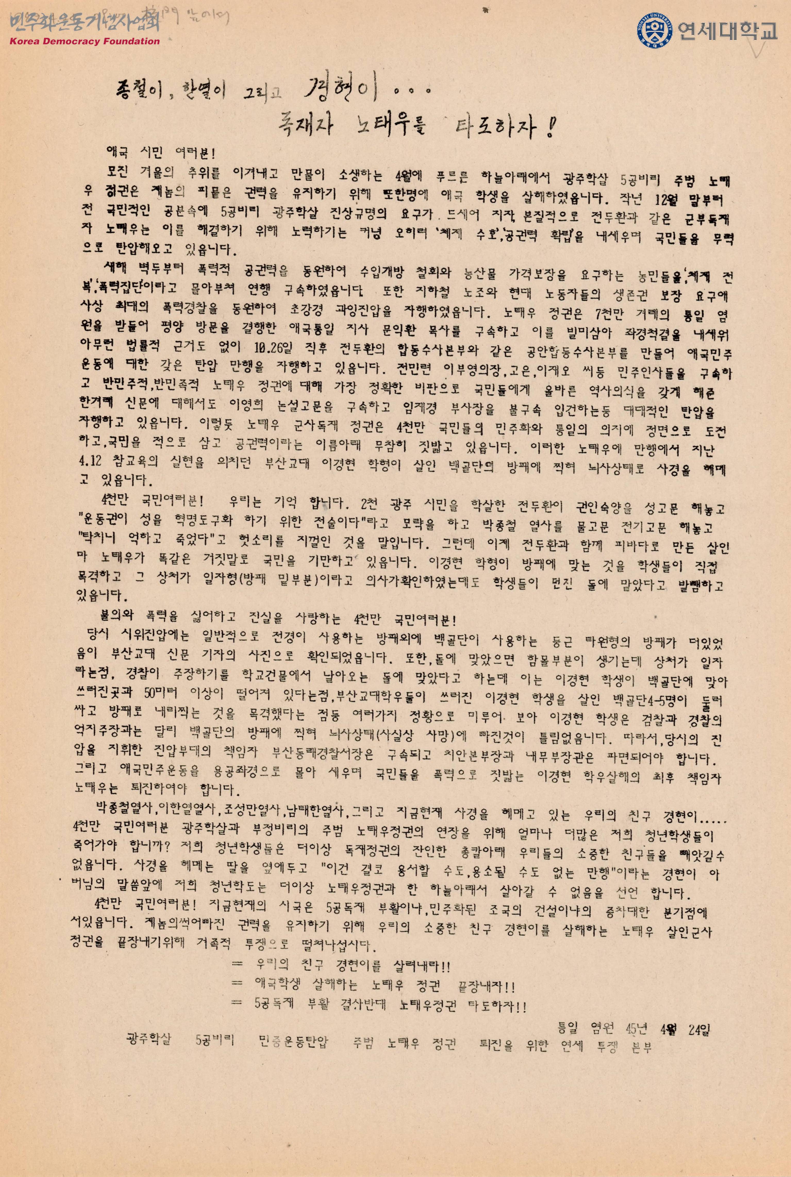 - 광주학살5공비리민중운동탄압주범노태우정권퇴진을위한연세투쟁본부