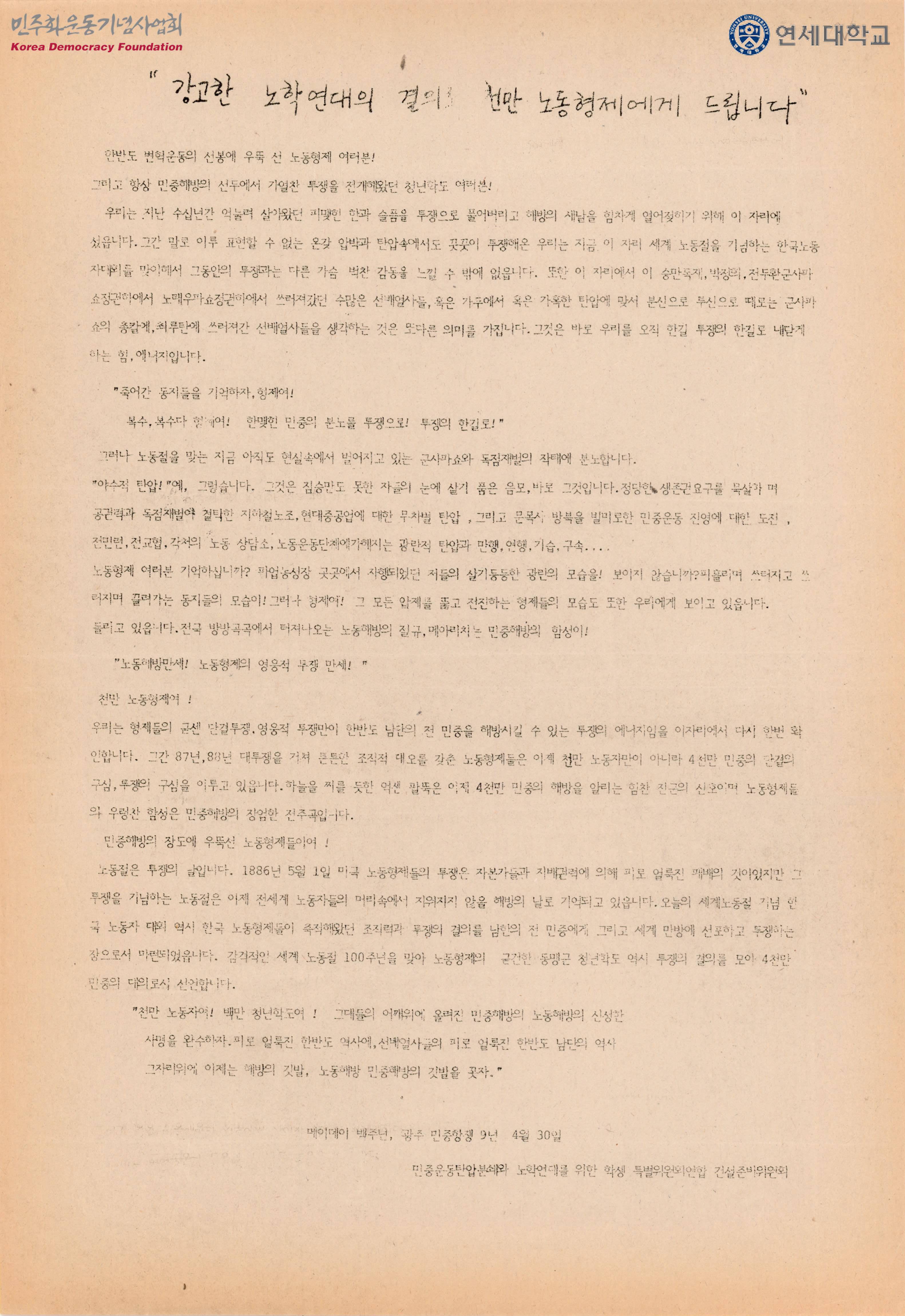 - 미국의 노동형제들의 투쟁은 자본가들과 지배권력에 의해 피로 얼룩진 패배의 것이었지만 그 투쟁을 기념하는 노동절은 이제 전세계 노동자들의 머리속에서 지워지지 않을 해방의 날로 기억되고 있고 오늘의 세계노동절 기념 한국 노동자 대회 역시 한국 노동형제들이 축적해왔던 조직력과 투쟁의 결의를 남한의 전 민중에게 그리고 세계만방에 선포하고 투쟁하는 기회가 될것이라는 내용이 수록된 유인물