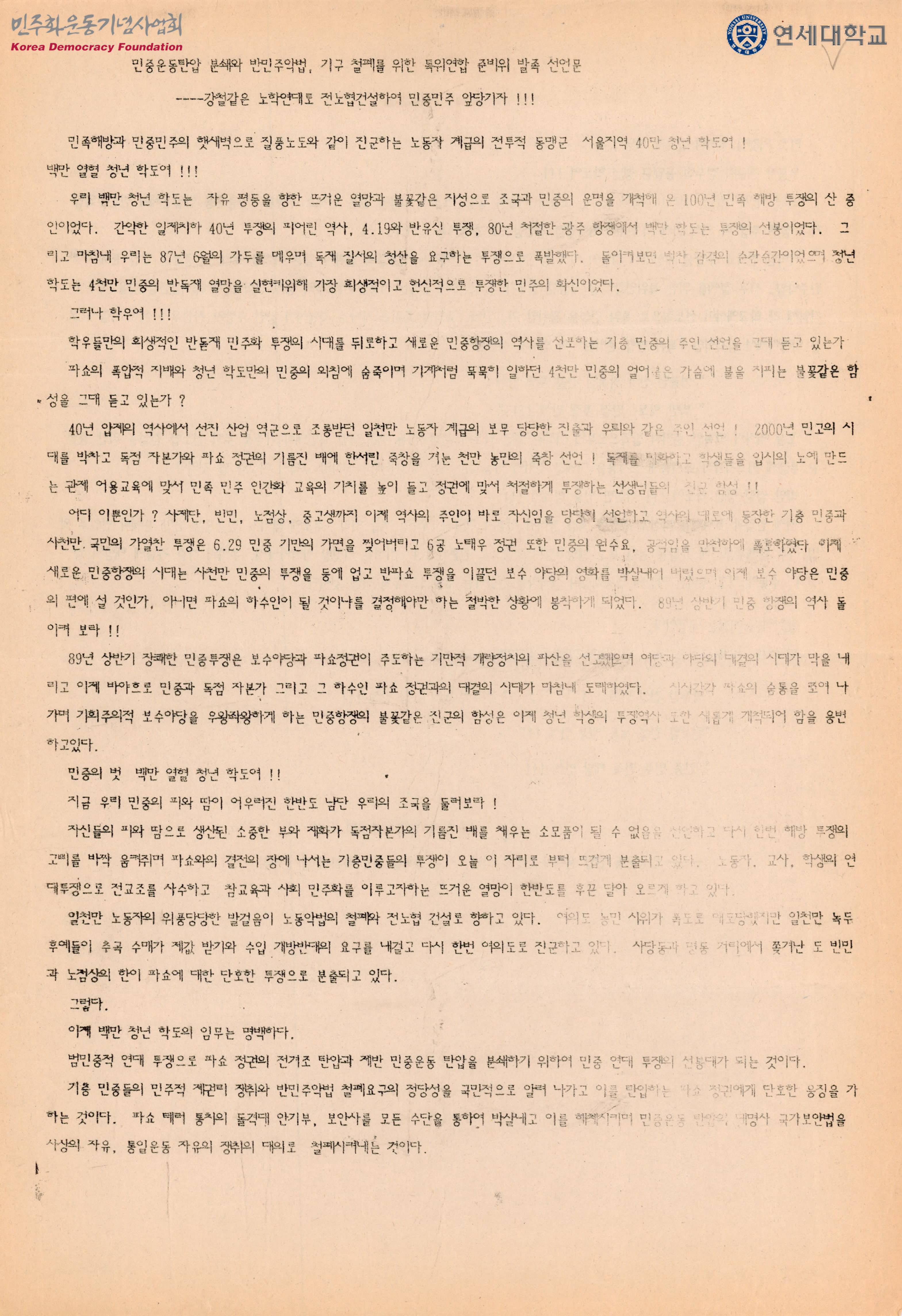 - 반파쇼 투쟁을 수행하기 위하여 청년학도와 서총련에게는 "민중운동 탄압 분쇄와 반 민주악법, 기구 철폐를 위한 특위연합"을 구성할 임무가 주어졌으며, 서총련 지도부에 정치 조직적 과제를 실현할 것을 촉구하기위해 각 학교에서의 선도적으로 특위 건설을 결의한 과, 단대, 총학의 특위를 하나로 결집시켜 "특위 연합 준비위"의 발족을 선언하는 내용이 수록된 유인물