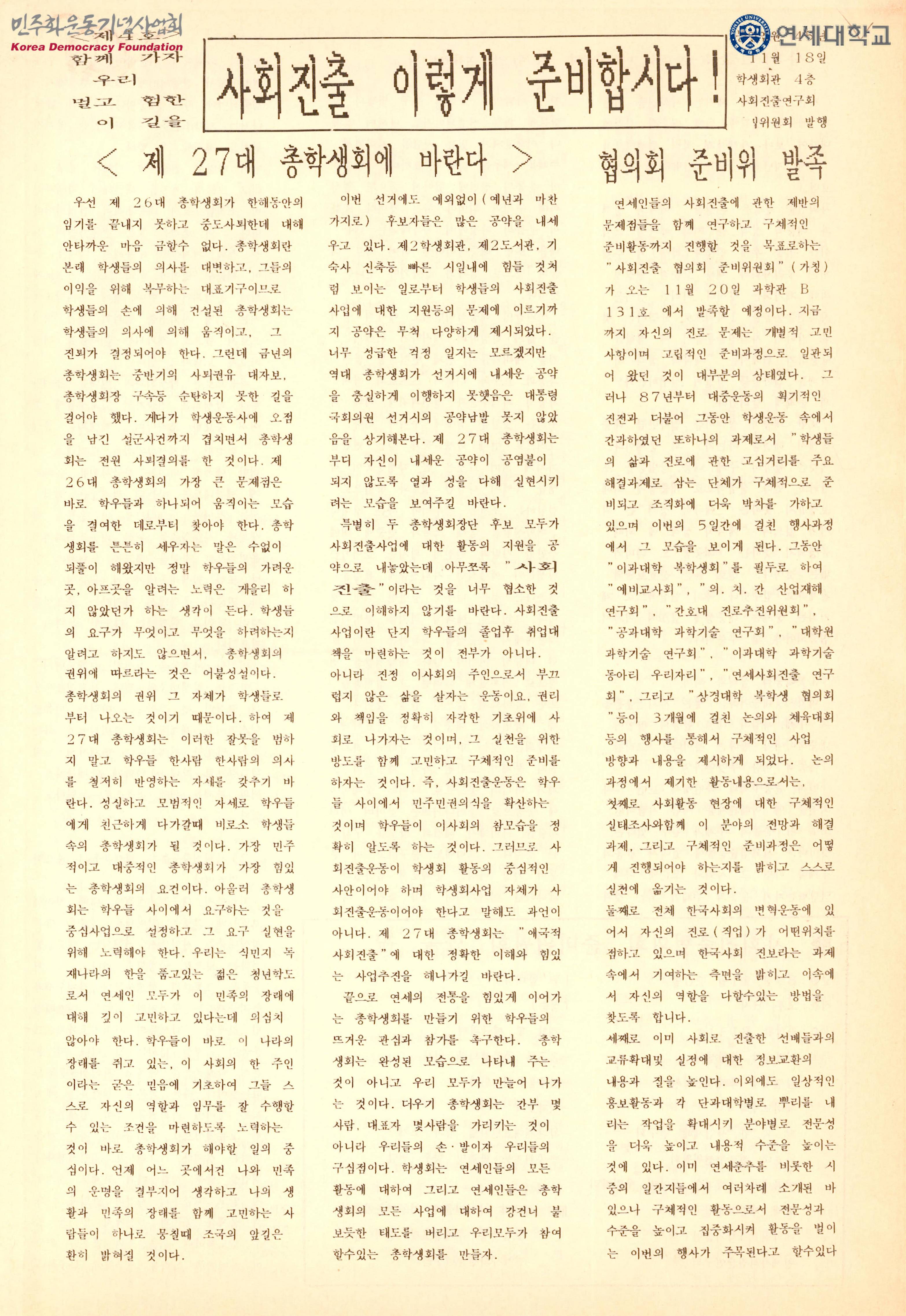 - 사회진출운동은 학우들 사이에서 민주민권의식을 확산하는 것이며 학우들이 이사회의 참모습을 정확히 알도록 하는 것이며 그러므로 사회진출운동이 학생회 활동의 중심적인 사안이어야 하며 27대 총학생회에 "애국적 사회진출"에 대한 정확한 이해와 힘있는 사업추진을 바라는 내용이 수록된 유인물